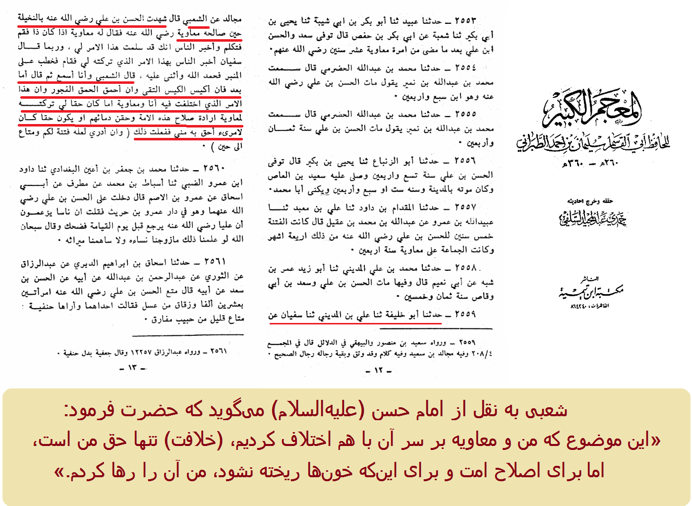 شعبی نیز به نقل از امام حسن (علیهالسلام) میگوید که حضرت فرمود: «... این موضوع که من و معاویه بر سر آن با هم اختلاف کردیم، (خلافت) تنها حق من است، اما برای اصلاح امت و برای اینکه خونها ریخته نشود، من آن را رها کردم...»