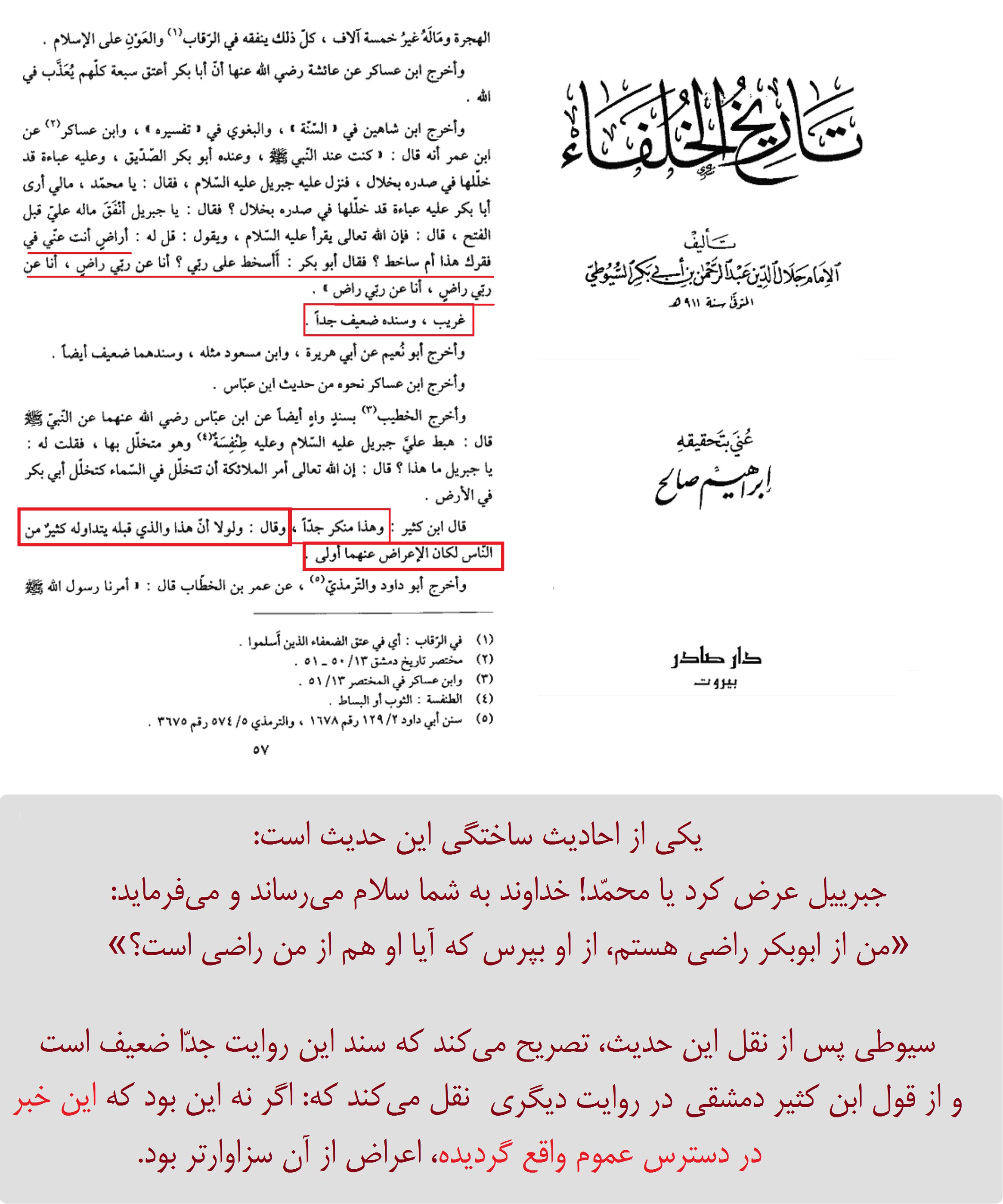 یکی از احادیث ساختگی این حدیث است: جبرییل عرض کرد يا محمّد! خداوند به شما سلام می‌‎رساند و می‌‎فرمايد: «من از ابوبكر راضی هستم، از او بپرس كه آيا او هم از من راضی است؟» سیوطی پس از نقل این حدیث، تصریح می‌کند که سند این روایت جدّا ضعیف است و از قول ابن کثیر دمشقی در روایت دیگری نقل می‌کند که: اگر نه این بود که این خبر در دسترس عموم واقع گردیده، اعراض از آن سزاوارتر بود. (یعنی چون این روایات ضعیف مشهور شده، نمی‌توان آنها را رد کرد.)