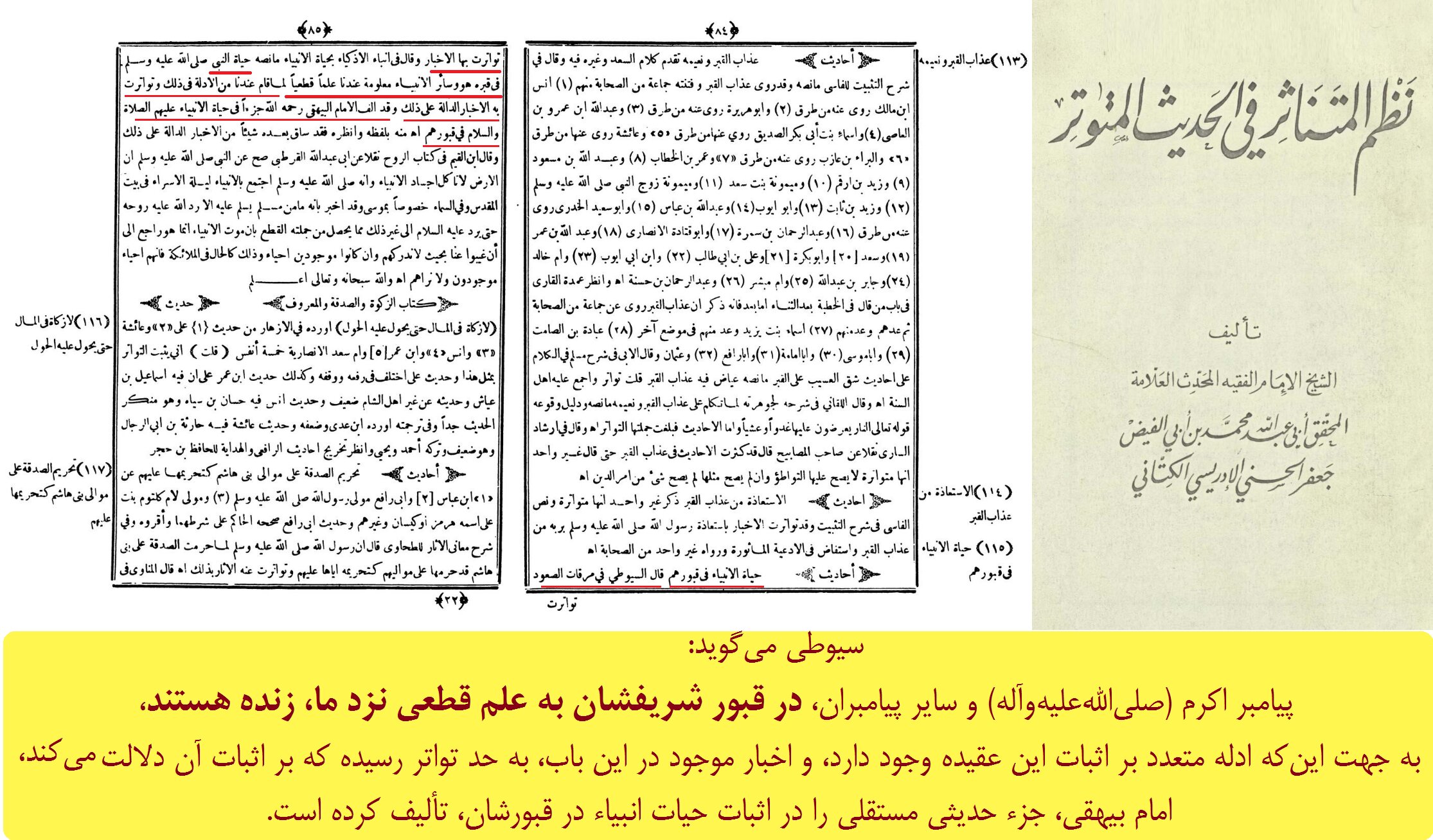 سیوطی می‌گوید‌: پیامبر اکرم (صلی‌الله‌علیه‌وآله) و سایر پیامبران، در قبور شریفشان به علم قطعی نزد ما، زنده هستند، به جهت این‌که ادله متعدد بر اثبات این عقیده وجود دارد، و اخبار موجود در این باب، به حد تواتر رسیده که بر اثبات آن دلالت می‌کند، و امام بیهقی، جزء حدیثی مستقلی را در اثبات حیات انبیاء در قبورشان، تألیف کرده است.