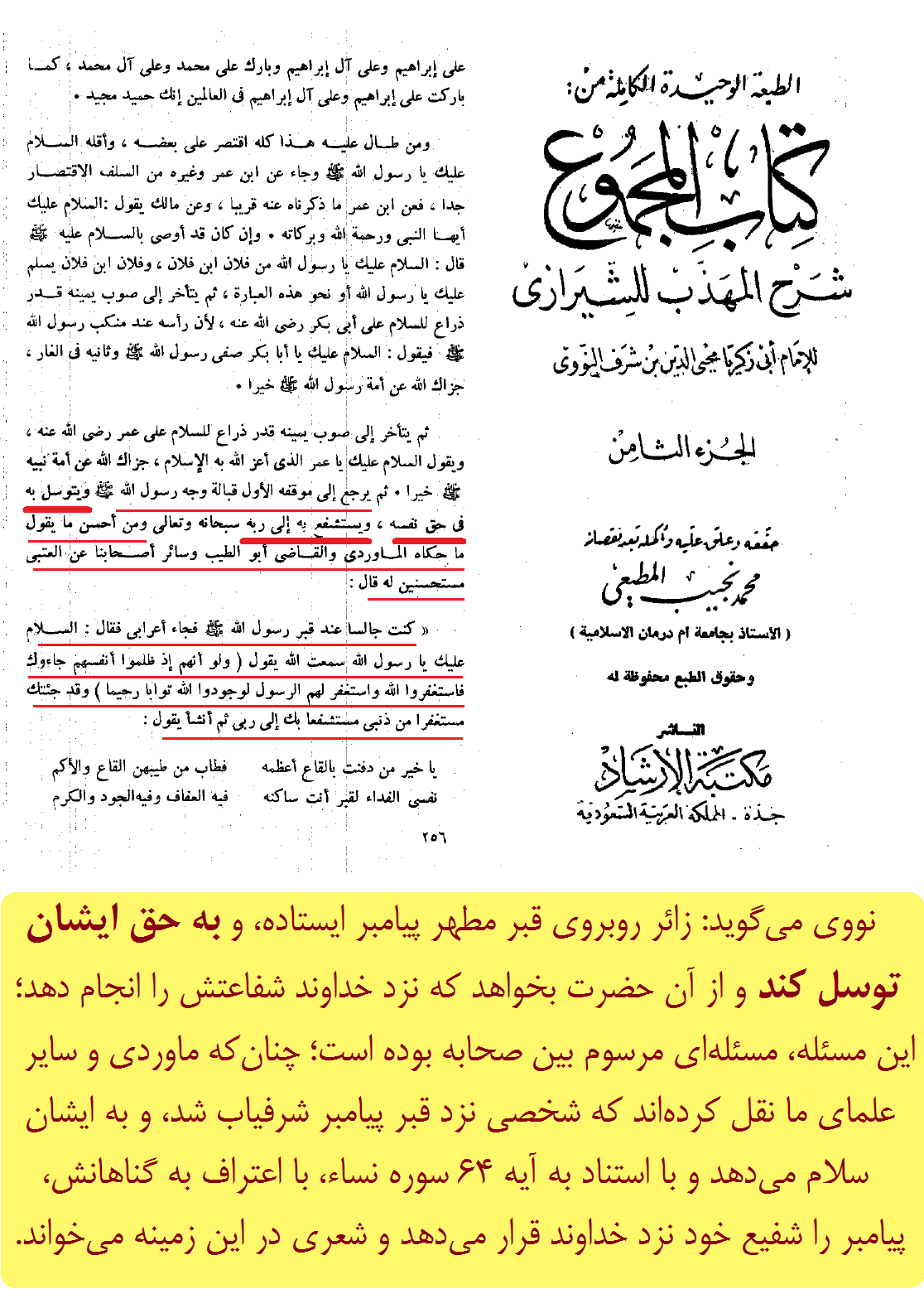 نووی میگوید: زائر روبروی قبر مطهر پیامبر ایستاده، و به حق ایشان توسل کند و از آن حضرت بخواهد که نزد خداوند شفاعتش را انجام دهد؛ این مسئله، مسئلهای مرسوم بین صحابه بوده است؛ چنانکه ماوردی و سایر علمای ما نقل کردهاند که شخصی نزد قبر پیامبر شرفیاب شد، و به ایشان سلام میدهد و با استناد به آیه 64 سوره نساء، با اعتراف به گناهانش، پیامبر را شفیع خود نزد خداوند قرار میدهد و شعری در این زمینه میخواند.