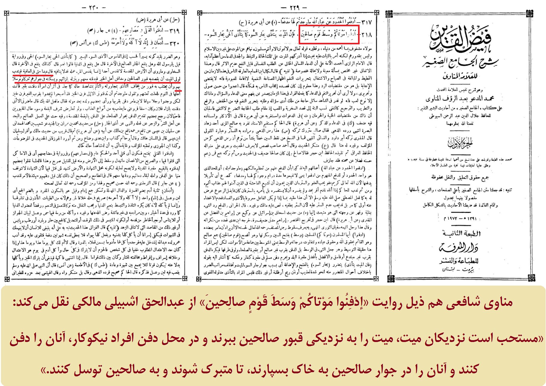 مناوی شافعی هم ذیل روایت «إدْفِنُوا مَوْتاكُمْ وَسَطَ قَوْمٍ صالِحينَ» از عبدالحق اشبيلی مالكی نقل می‌کند: «مستحب است نزدیکان میت، میت را به نزدیکی قبور صالحین ببرند و در محل دفن افراد نیکوکار، آنان را دفن کنند و آنان را در جوار صالحین به خاک بسپارند، تا متبرک شوند و به صالحین توسل کنند.»