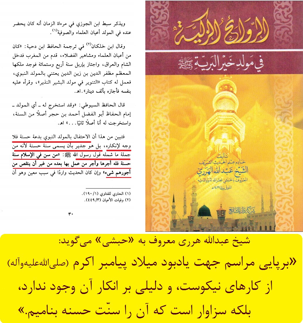 شیخ عبدالله هرری معروف به «حبشی» میگوید: «برپایی مراسم جهت یادبود میلاد پیامبر اکرم (صلیاللهعلیهوآله) از کارهای نیکوست، و دلیلی بر انکار آن وجود ندارد، بلکه سزاوار است که آن را سنّت حسنه بنامیم.»