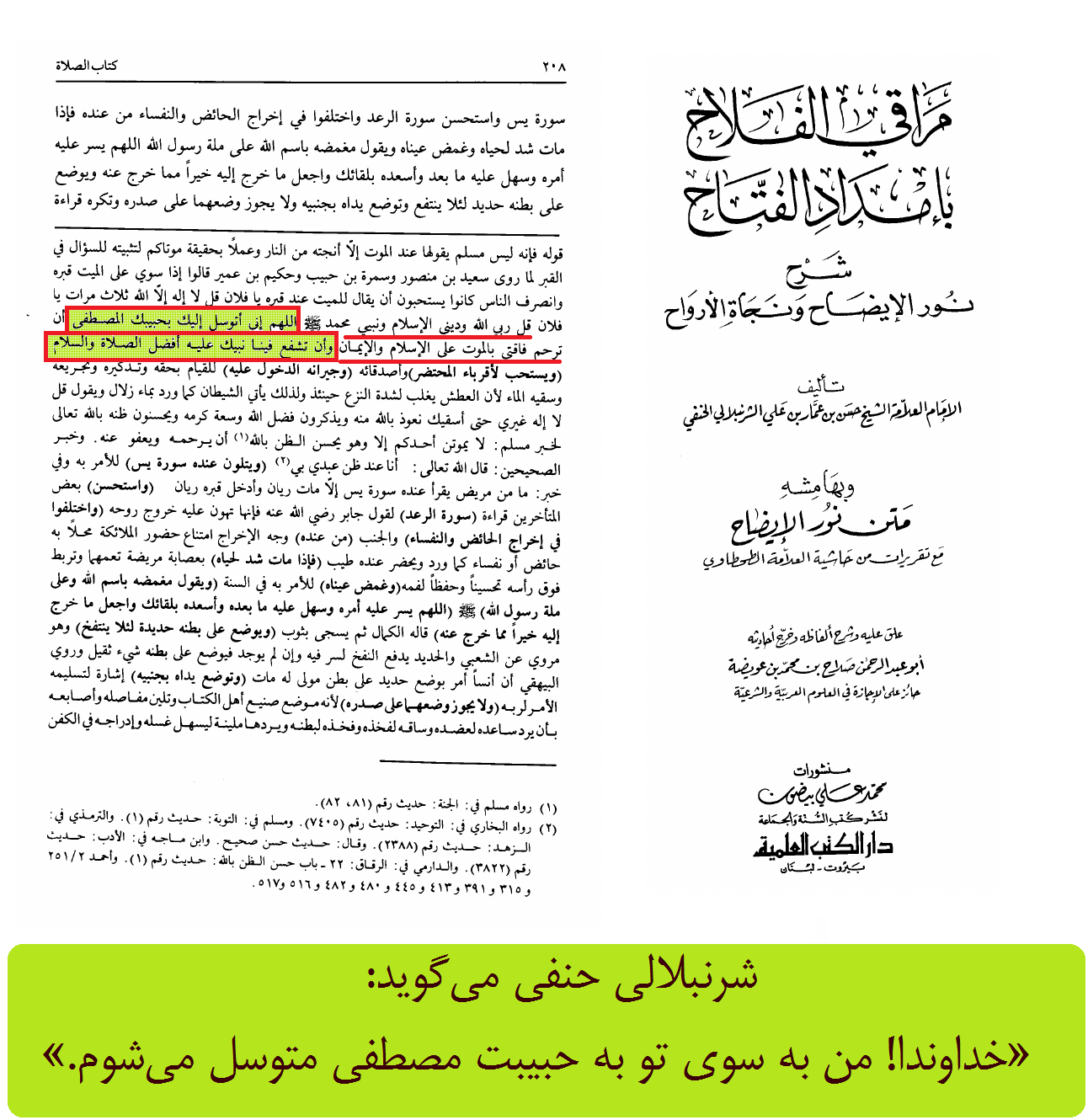 شرنبلالی حنفی میگوید: «خداوندا! من به سوی تو به حبیبت مصطفى متوسل میشوم.»