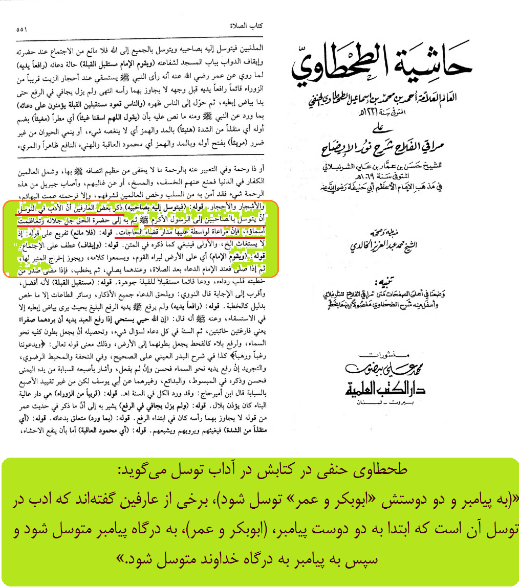 طحطاوی حنفی در کتابش در آداب توسل میگوید: «(به پیامبر و دو دوستش «ابوبکر و عمر» توسل شود)، برخی از عارفین گفتهاند که ادب در توسل آن است که ابتدا به دو دوست پیامبر، (ابوبکر و عمر)، به درگاه پیامبر متوسل شود و سپس به پیامبر به درگاه خداوند متوسل شود.»
