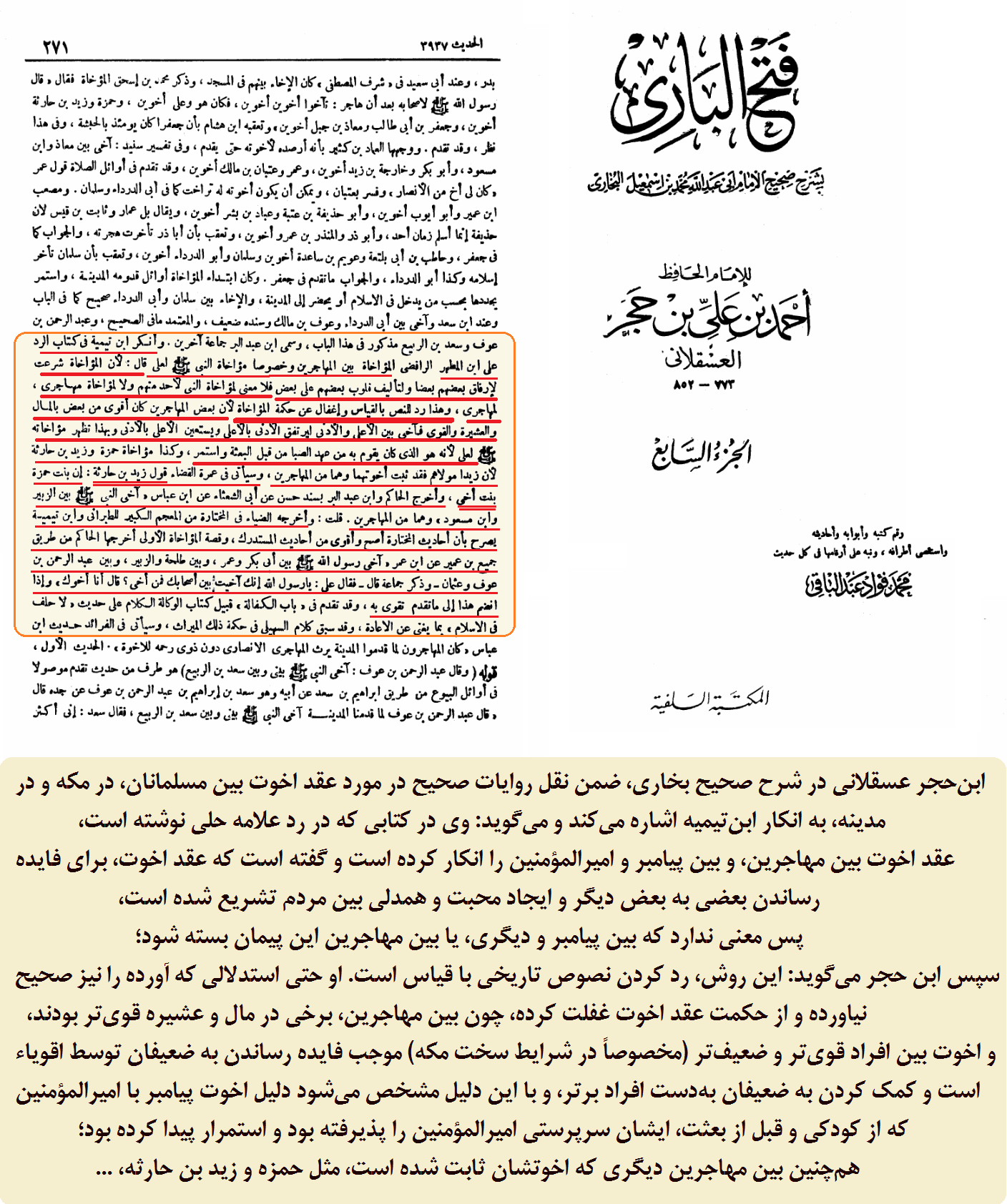 ابنحجر عسقلانی در شرح صحیح بخاری، ضمن نقل روایات صحیح در مورد عقد اخوت بین مسلمانان، در مکه و در مدینه، به انکار ابنتیمیه اشاره میکند و میگوید: وی در کتابی که در رد علامه حلی نوشته است، عقد اخوت بین مهاجرین، و بین پیامبر و امیرالمؤمنین را انکار کرده است و گفته است که عقد اخوت، برای فایده رساندن بعضی به بعض دیگر و ایجاد محبت و همدلی بین مردم تشریع شده است، پس معنی ندارد که بین پیامبر و دیگری، یا بین مهاجرین این پیمان بسته شود؛ سپس ابن حجر میگوید: این روش، رد کردن نصوص تاریخی با قیاس است. او حتی استدلالی که آورده را نیز صحیح نیاورده و از حکمت عقد اخوت غفلت کرده، چون بین مهاجرین، برخی در مال و عشیره قویتر بودند، و اخوت بین افراد قویتر و ضعیفتر (مخصوصاً در شرایط سخت مکه) موجب فایده رساندن به ضعیفان توسط اقویاء است و کمک کردن به ضعیفان بهدست افراد برتر، و با این دلیل مشخص میشود دلیل اخوت پیامبر با امیرالمؤمنین که از کودکی و قبل از بعثت، ایشان سرپرستی امیرالمؤمنین را پذیرفته بود و استمرار پیدا کرده بود؛ همچنین بین مهاجرین دیگری که اخوتشان ثابت شده است، مثل حمزه و زید بن حارثه، ...
