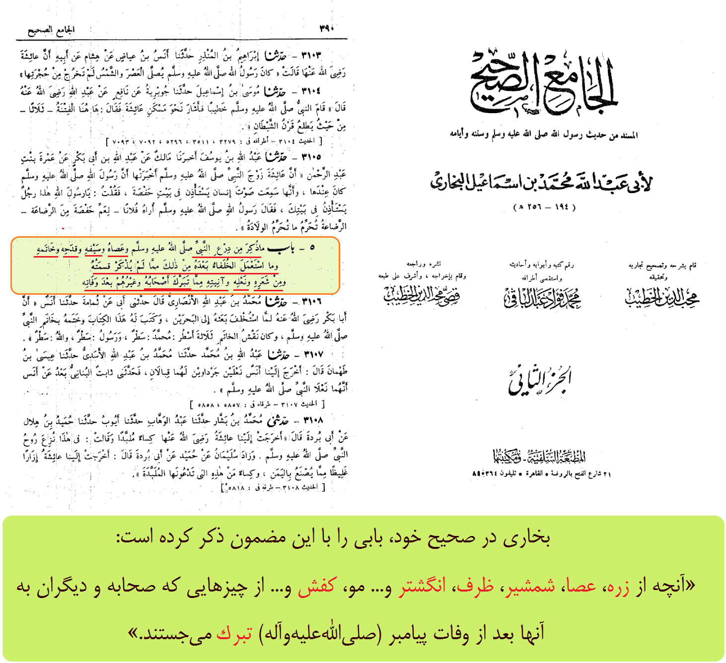 بخارى در صحیح خود، بابى را با این مضمون ذكر كرده است: «آنچه از زره، عصا، شمشیر، ظرف، انگشتر و... مو، كفش و... از چیزهایى كه صحابه و دیگران به آنها بعد از وفات پیامبر (صلىاللهعلیهوآله) تبرك مىجستند.»