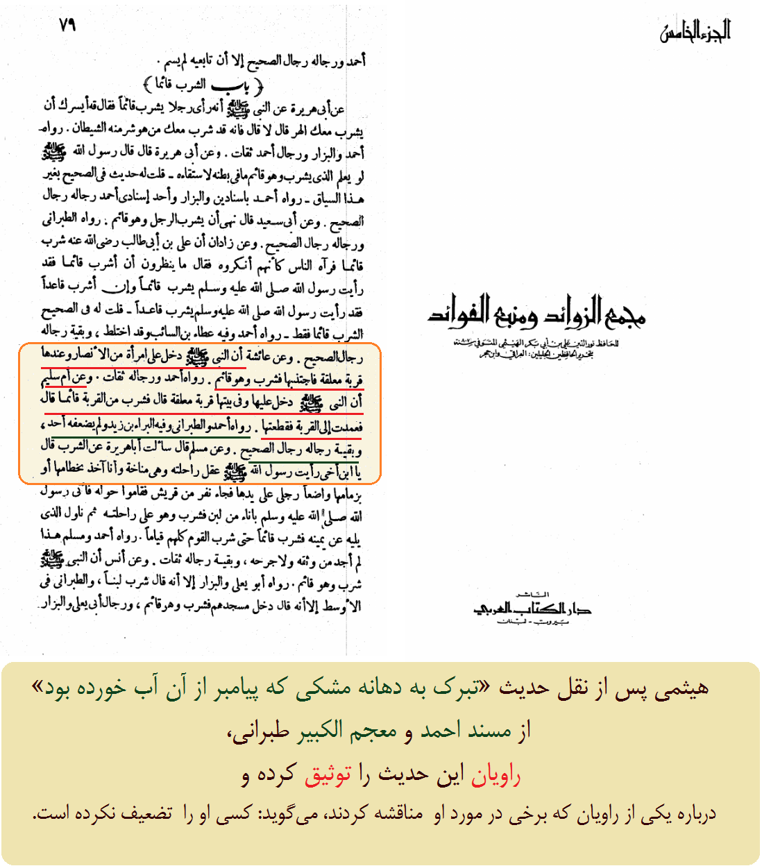هیثمی پس از نقل حدیث «تبرک به دهانه مشکی که پیامبر از آن آب خورده بود» از مسند احمد و معجم الکبیر طبرانی، راویان این حدیث را توثیق کرده و درباره یکی از راویان که برخی در مورد او  مناقشه کردند، می‌گوید: کسی او را  تضعیف نکرده است.