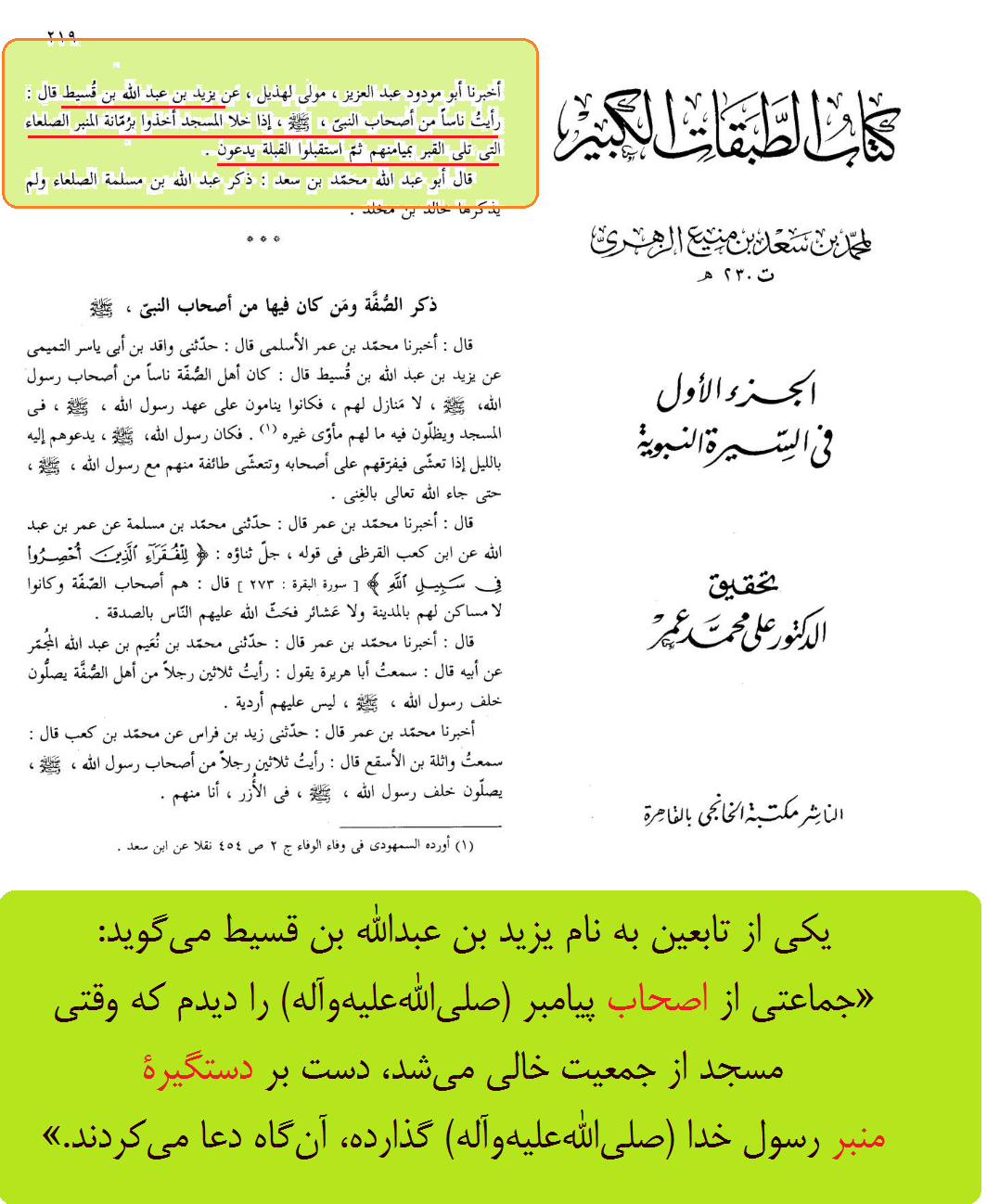 یکی از تابعین به نام یزید بن عبداللّٰه بن قسیط مى‌گوید: «جماعتى از اصحاب پیامبر (صلى‌الله‌علیه‌وآله) را دیدم كه وقتى مسجد از جمعیت خالى مى‌شد، دست بر دستگیرۀ منبر رسول خدا (صلى‌الله‌علیه‌وآله) گذارده، آن‌گاه دعا مى‌کردند.»
