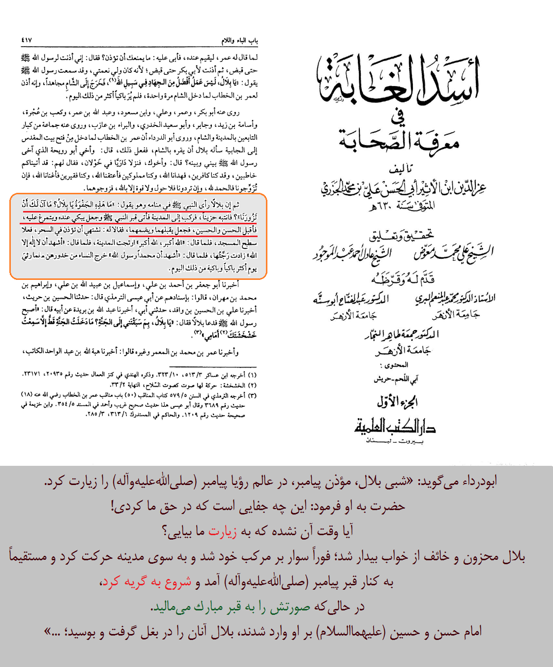 ابودرداء میگوید: «شبى بلال، مؤذن پیامبر، در عالم رؤیا پیامبر (صلىاللهعلیهوآله) را زیارت کرد. حضرت به او فرمود: این چه جفایى است كه در حق ما کردى! آیا وقت آن نشده كه به زیارت ما بیایى؟ بلال محزون و خائف از خواب بیدار شد؛ فوراً سوار بر مركب خود شد و به سوى مدینه حركت کرد و مستقیماً به كنار قبر پیامبر (صلىاللهعلیهوآله) آمد و شروع به گریه كرد، در حالىكه صورتش را به قبر مبارك مىمالید. امام حسن و حسین (علیهماالسلام) بر او وارد شدند، بلال آنان را در بغل گرفت و بوسید؛ ...»