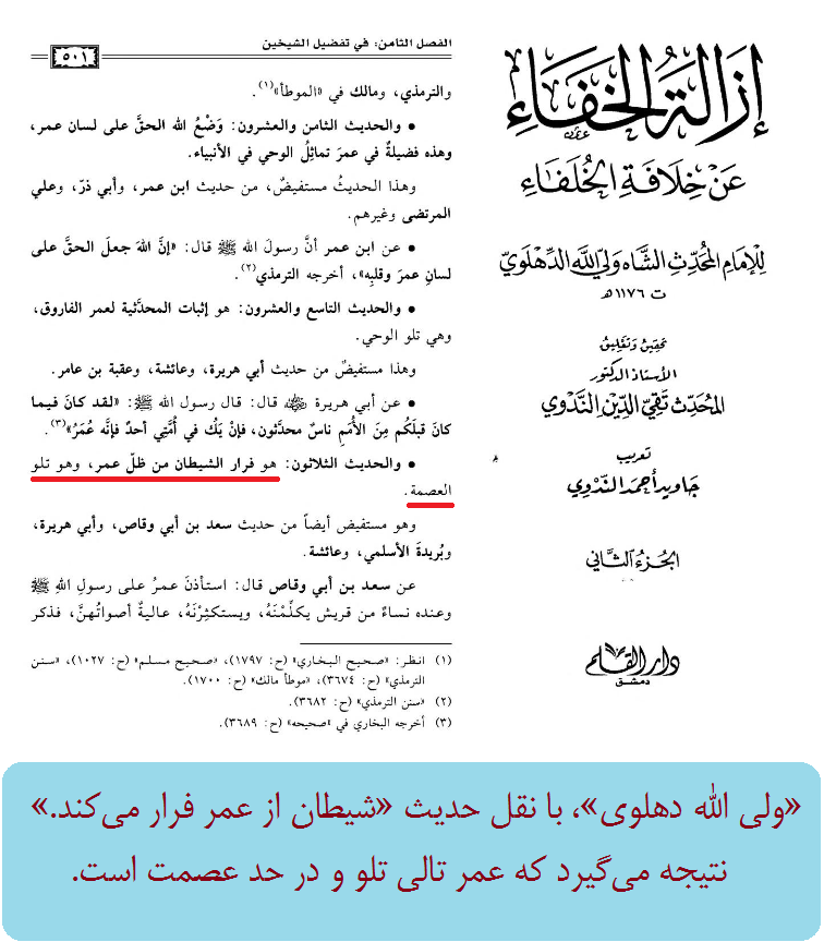 «ولی الله دهلوی»، با نقل حدیث «شیطان از عمر فرار میکند.» نتیجه میگیرد که عمر تالی تلو و در حد عصمت است.