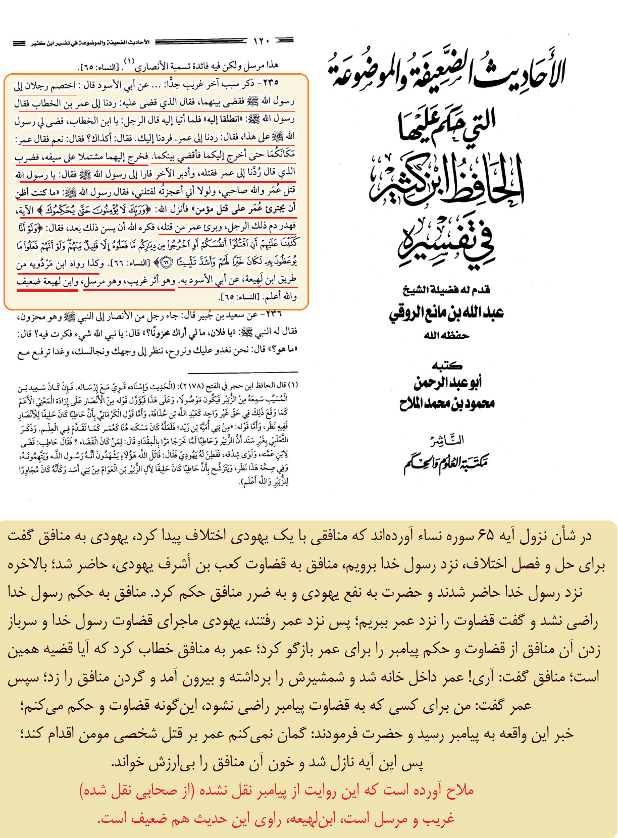 الاحادیث الضعیفه و الموضوعه التی حکم علیها الحافظ ابن کثیر فی تفسیره، محمود ملاح، ص120.
