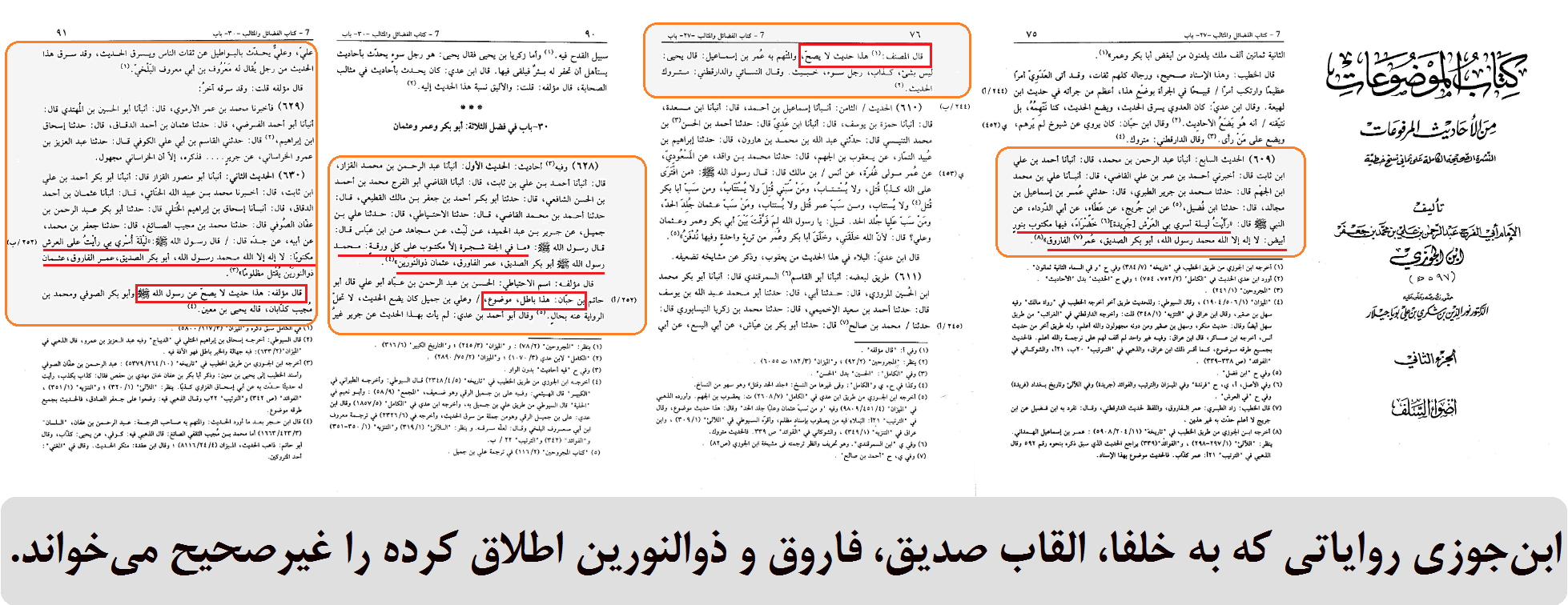 ابن جوزی روایاتی که به خلفا، القاب صدیق، فاروق و ذوالنورین اطلاق کرده را غیرصحیح می‌خواند.