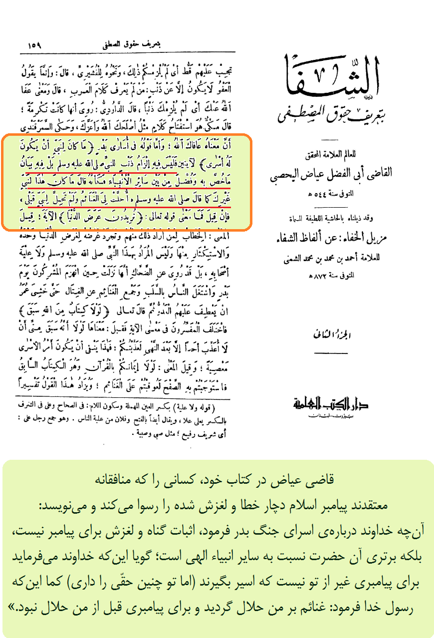 قاضی عیاض در کتاب خود، کسانی را که منافقانه معتقدند پیامبر اسلام دچار خطا و لغزش شده را رسوا میکند و مینویسد: آنچه خداوند دربارهی اسرای جنگ بدر فرمود، اثبات گناه و لغزش برای پیامبر نیست، بلکه برتری آن حضرت نسبت به سایر انبیاء الهی است؛ گویا اینکه خداوند میفرماید برای پیامبری غیر از تو نیست که اسیر بگیرند (اما تو چنین حقّی را داری) کما اینکه رسول خدا فرمود: غنائم بر من حلال گردید و برای پیامبری قبل از من حلال نبود.»