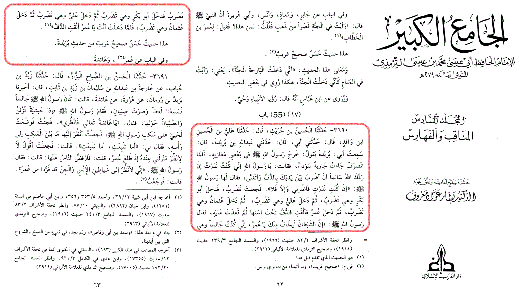 از جملهی احادیث جعلی و دروغین، این حدیث از بریده بن حصیب است که نقل میکند: «رسول خدا در بعضی از جنگها از مدینه خارج شدند، پس چون مراجعت کردند، کنیز سیاهی جلو آمد و عرضه داشت یا رسول الله! من نذر کردهام که اگر خداوند شما را سلامت و بدون گرفتاری به مدینه بازگرداند، در برابر شما به غنا و دایره زدن بپردازم. حضرت جواب داد، اگر نذر کردهای انجام بده والاّ نه؛ پس آن کنیز و جاریه هم شروع به خواندن و زدن کرد، در این حال ابوبکر داخل شد، علی (علیهالسلام) هم داخل شد، و بعد مدتی کوتاه عثمان هم داخل شد، و این کنیز میخواند و میزد، تا اینکه عمر بن خطاب داخل شد، بلافاصله کنیز دایره را در زیر خود پنهان کرد و روی آن نشست. رسول خدا فرمود: ای عمر! بهدرستیکه شیطان از تو میترسد...»[1] ترمذی بعد نقل حدیث میگوید: حدیث حسن صحیح و غریب است.