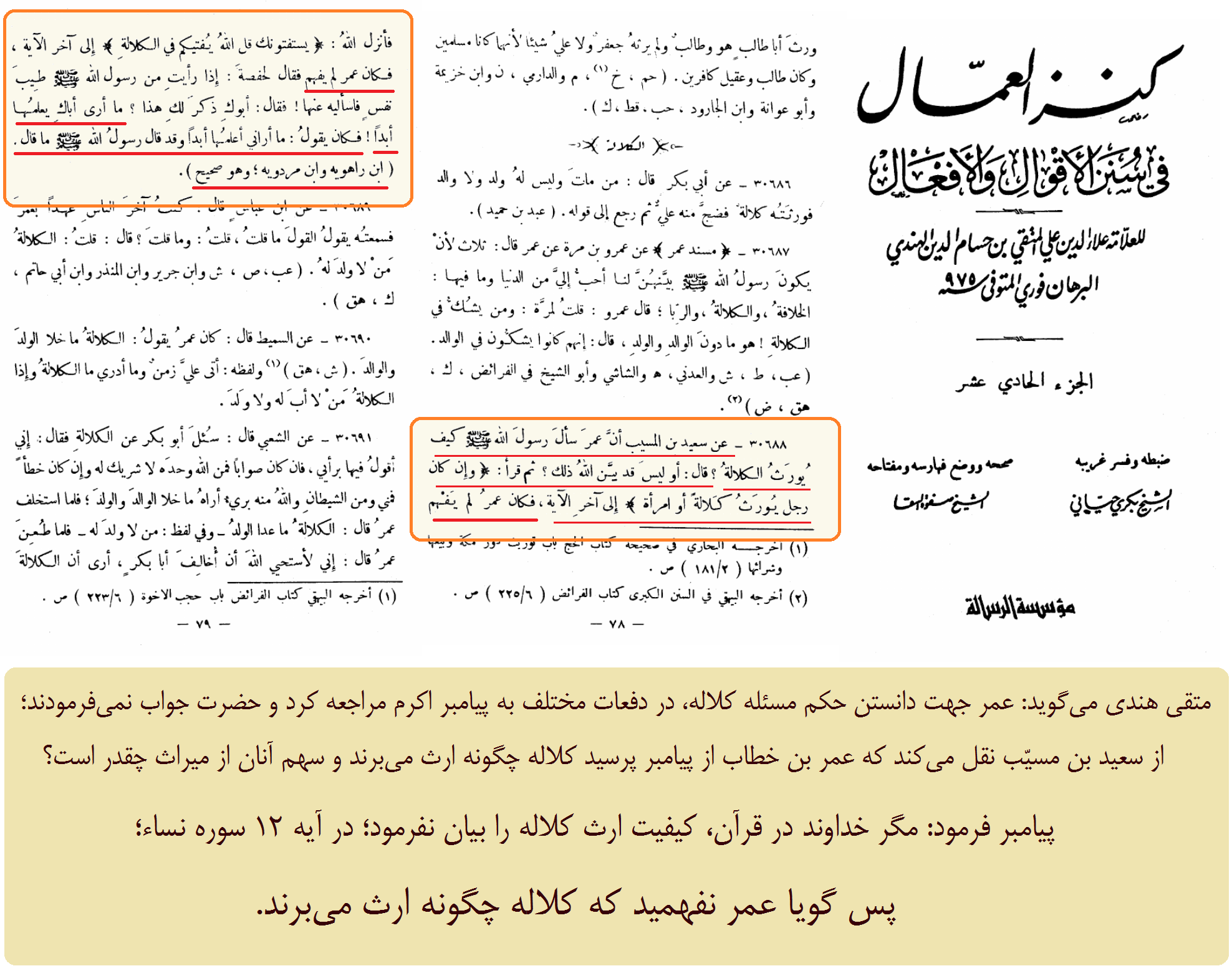 متقی هندی می‌گوید: عمر جهت دانستن حکم مسئله کلاله، در دفعات مختلف به پیامبر اکرم مراجعه کرد و حضرت جواب نمی‌فرمودند؛ از سعید بن مسیّب نقل می‌کند که عمر بن خطاب از پیامبر پرسید کلاله چگونه ارث می‌برند و سهم آنان از میراث چقدر است؟ پیامبر فرمود: مگر خداوند در قرآن، کیفیت ارث کلاله را بیان نفرمود؛ در آیه 12 سوره نساء؛ پس گویا عمر نفهمید که کلاله چگونه ارث می‌برند.