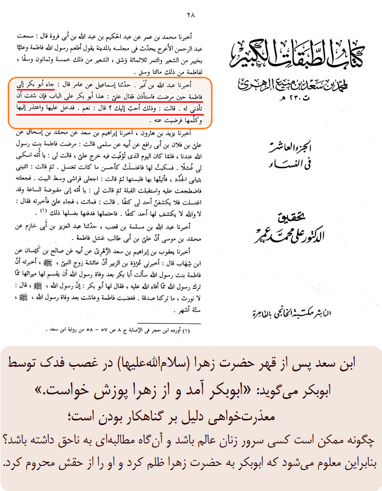 ابن سعد پس از قهر حضرت زهرا (سلام‌الله‌علیها) در غصب فدک توسط ابوبکر می‌گوید: «ابوبکر آمد و از زهرا پوزش خواست.»