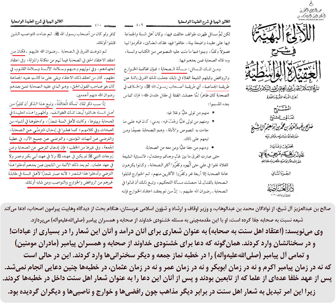 صالح بن عبدالعزیز آل شیخ، از نوادگان محمد بن عبدالوهاب، و وزیر اوقاف و ارشاد و شؤون اسلامی عربستان، هنگام بحث از دیدگاه وهابیت پیرامون اصحاب، ادعا می‌کند شیعه نسبت به صحابه جفا کرده است، او با این مقدمه‌چینی به مسئله خشنودی خداوند از صحابه و همسران پیامبر (صلی‌الله‌علیه‌وآله) می‌پردازد.
