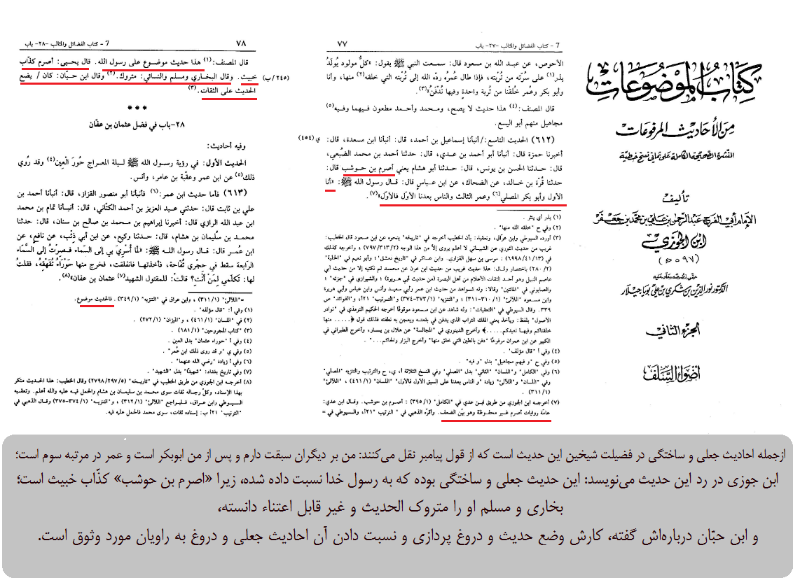 ازجمله احادیث جعلی و ساختگی در فضیلت شیخین این حدیث است که از قول پیامبر نقل میکنند: من بر دیگران سبقت دارم و پس از من ابوبکر است و عمر در مرتبه سوم است؛ ابن جوزی در رد این حدیث مینویسد: این حدیث جعلی و ساختگی بوده که به رسول خدا نسبت داده شده، زیرا «اصرم بن حوشب» کذّاب خبیث است؛ بخاری و مسلم او را متروک الحدیث و غیر قابل اعتناء دانسته، و ابن حبّان دربارهاش گفته، کارش وضع حدیث و دروغ پردازی و نسبت دادن آن احادیث جعلی و دروغ به راویان مورد وثوق است.