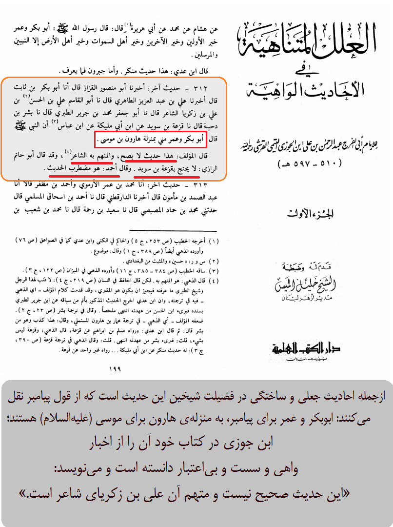 ازجمله احادیث جعلی و ساختگی در فضیلت شیخین این حدیث است که از قول پیامبر نقل میکنند: ابوبکر و عمر برای پیامبر، به منزلهی هارون برای موسی (علیهالسلام) هستند؛ ابن جوزی در کتاب خود آن را از اخبار واهی و سست و بیاعتبار دانسته است و مینویسد: «این حدیث صحیح نیست و متهم آن علی بن زکریای شاعر است.»