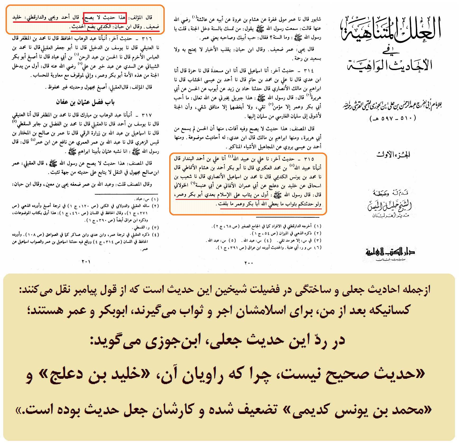 ازجمله احادیث جعلی و ساختگی در فضیلت شیخین این حدیث است که از قول پیامبر نقل می‌کنند: کسانیکه بعد از من، برای اسلامشان اجر و ثواب می‌گیرند، ابوبکر و عمر هستند؛ در ردّ این حدیث جعلی، ابن‌جوزی می‌گوید: «حدیث صحیح نیست، چرا که راویان آن، «خلید بن دعلج» و «محمد بن یونس کدیمی» تضعیف شده و کارشان جعل حدیث بوده است.»
