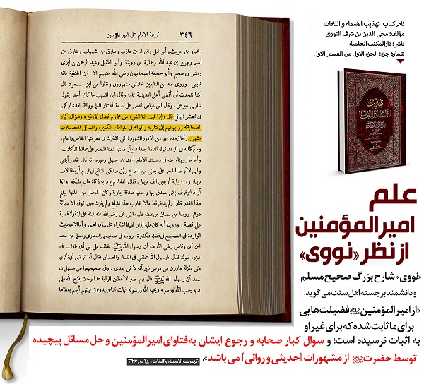 و جالبتر اینکه خود صحابه، مانند عایشه اعتراف کرده و میگوید: «علی أعلم الناس بالسنه.[8]علی آشناترین فرد به سنت است.» و یا عمر بن خطاب میگوید: «یتعوذ بالله من معضله لیس لها ابوالحسن یعنی علی بن ابیطالب.[9] پناه میبرم به خدا از هر مشکلی که علی در آن حاضر نباشد.» و یا معاویه وقتی شنید حضرت علی (علیهالسلام) به شهادت رسید، گفت: «لقد ذهب الفقه و العلم بموت ابن ابیطالب.[10] فقه و علم، با کشته شدن پسر ابوطالب رخت بربست.» و یا ابن عباس میگوید: «علمی و علم اصحاب محمد فی علم علی، الاّ کقطره فی سبعه أبحر.[11] علم و دانش من و اصحاب رسول خدا، در قبال علم و دانش علی (علیهالسلام)، مانند قطرهای در برابر هفت دریاست.»