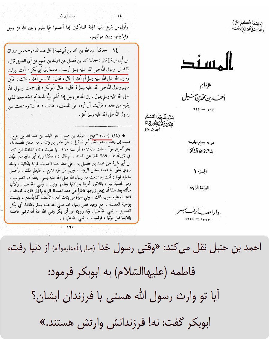 احمد بن حنبل نقل می‌كند: «وقتی رسول خدا (صلی‌الله‌علیه‌وآله) از دنيا رفت، فاطمه (علیها‌السّلام) به ابوبكر فرمود: آيا تو وارث رسول الله هستی يا فرزندان ایشان؟ ابوبكر گفت: نه! فرزندانش وارثش هستند.»