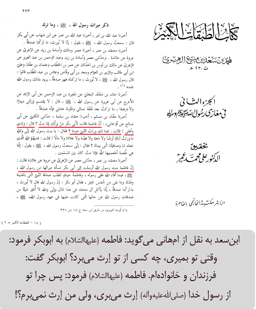 ابن‌سعد به نقل از ام‌هانی می‌گويد: فاطمه (علیها‌السّلام) به ابوبكر فرمود: وقتی تو بميری، چه كسی از تو إرث می‌برد؟ ابوبكر گفت: فرزندان و خانواده‌ام. فاطمه (علیها‌السّلام) فرمود: پس چرا تو از رسول خدا (صلی‌الله‌علیه‌وآله) إرث می‌بری، ولی من إرث نمی‌برم؟!