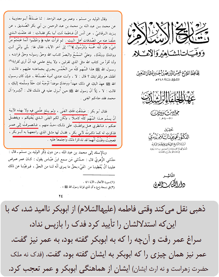 ذهبی نقل می‌کند وقتی فاطمه (علیها‌السّلام) از ابوبكر نااميد شد، که با این‌که استدلالشان را تأیید کرد فدک را بازپس نداد، سراغ عمر رفت و آن‌چه را كه به ابوبكر گفته بود، به عمر نيز گفت. عمر نيز همان چيزی را كه ابوبكر به ایشان گفته بود، گفت. (فدک نه ملک حضرت زهراست و نه ارث ایشان) ایشان از هماهنگی ابوبکر و عمر تعجب کرد.