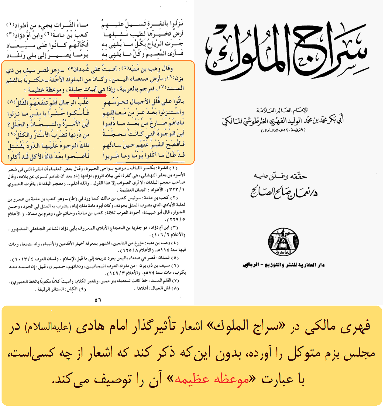 فهری مالکی در «سراج الملوك» اشعار تأثیرگذار امام هادی (علیه‌السلام) در مجلس بزم متوکل را آورده، بدون این‌که ذکر کند که اشعار از چه کسی‌است، با عبارت «موعظه عظیمه» آن را توصیف می‌کند.