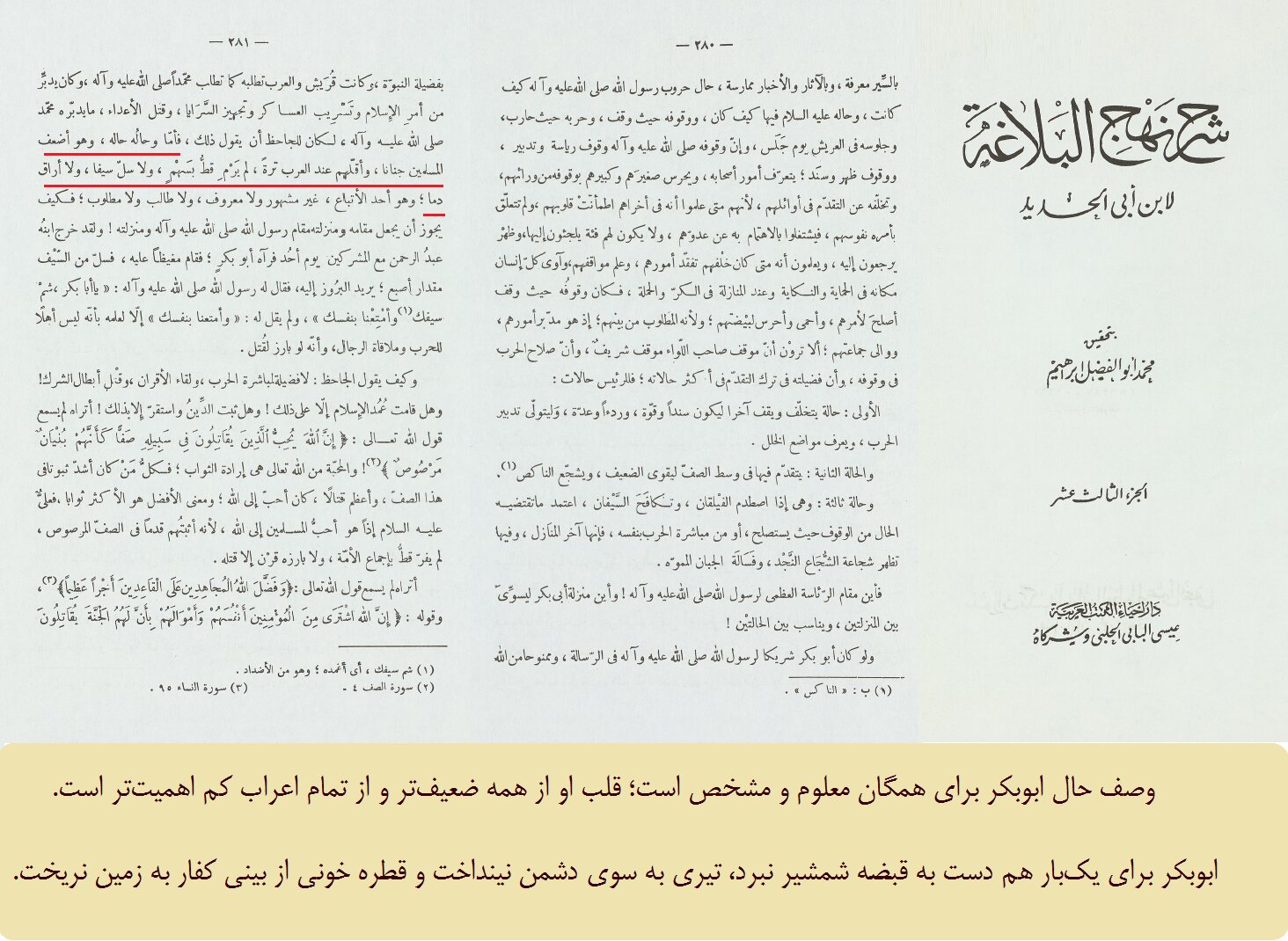 وصف حال ابوبکر برای همگان معلوم و مشخص است؛ قلب او از همه ضعیفتر و از تمام اعراب کم اهمیتتر است. ابوبکر برای یکبار هم دست به قبضه شمشیر نبرد، تیری به سوی دشمن نینداخت و قطره خونی از بینی کفار به زمین نریخت.