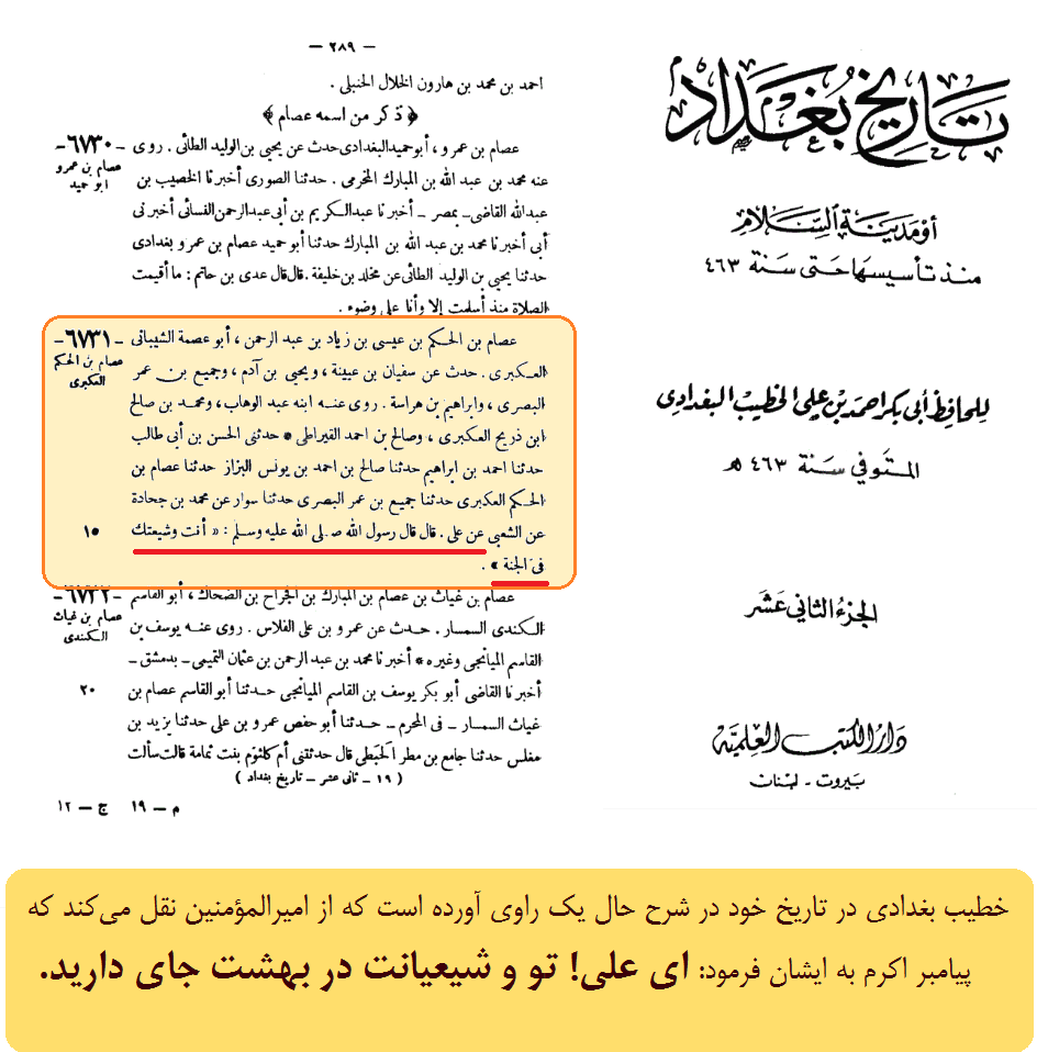 خطیب بغدادی در تاریخ خود در شرح حال یک راوی آورده است که از امیرالمؤمنین نقل میکند که پیامبر اکرم به ایشان فرمود: ای علی! تو و شیعیانت در بهشت جای دارید.
