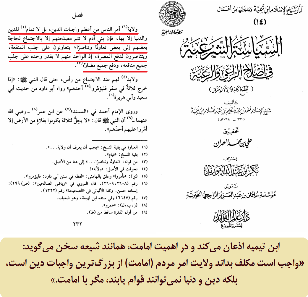 ابن تیمیه به این مطلب نیز اذعان کرده و در اهمیت امامت، همانند شیعه سخن گفته که: «واجب است مکلف بداند ولایت امر مردم (امامت) از بزرگترین واجبات دین است، بلکه دین و دنیا نمیتوانند قوام یابند، مگر با امامت.»