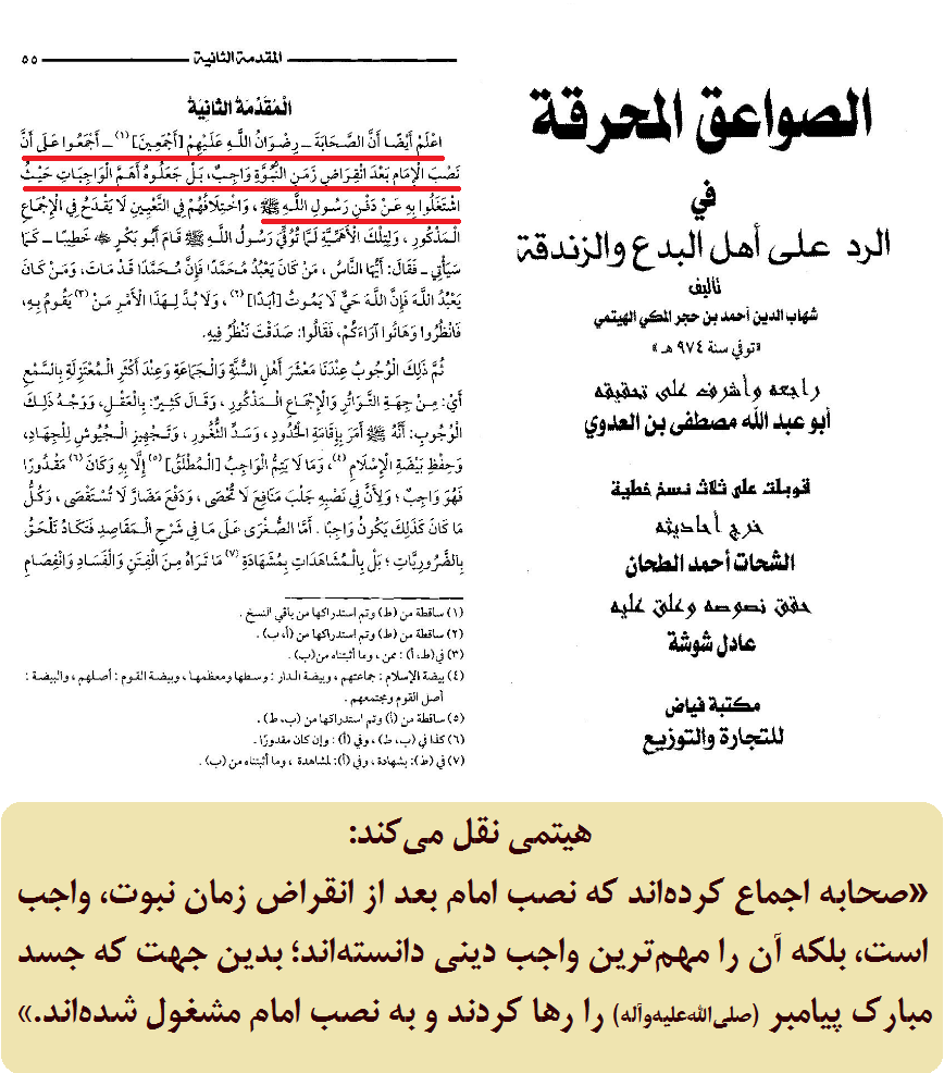 هیتمی نقل میکند که: «بدانکه صحابه اجماع کردهاند بر اینکه نصب امام بعد از انقراض زمان نبوت، واجب است، بلکه آن را مهمترین واجب دینی دانستهاند؛ بدین جهت که جسد مبارک پیامبر (صلیاللهعلیهوآله) را رها کردند و به نصب امام مشغول شدهاند.»