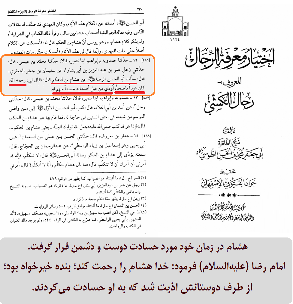 هشام در زمان خود مورد حسادت دوست و دشمن قرار گرفت. امام رضا (علیهالسلام) فرمود: خدا هشام را رحمت کند؛ بنده خیرخواه بود؛ از طرف دوستانش اذیت شد که به او حسادت میکردند.