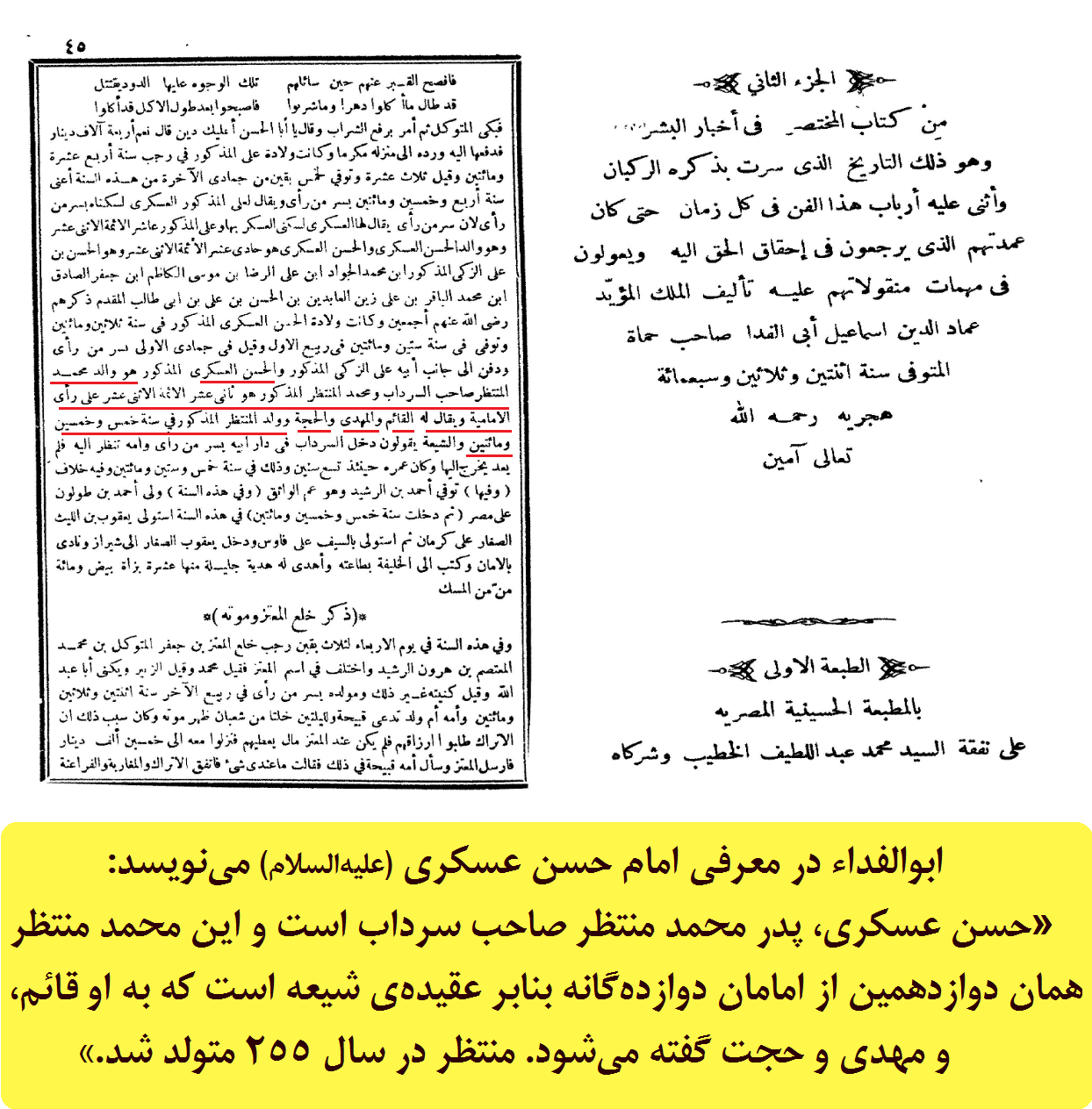 ابوالفداء در معرفی امام حسن عسکری (علیهالسلام) مینویسد: «حسن عسکری، پدر محمد منتظر صاحب سرداب است و این محمد منتظر همان دوازدهمین از امامان دوازدهگانه بنابر عقیدهی شیعه است که به او قائم، و مهدی و حجت گفته میشود. منتظر در سال 255 متولد شد.»