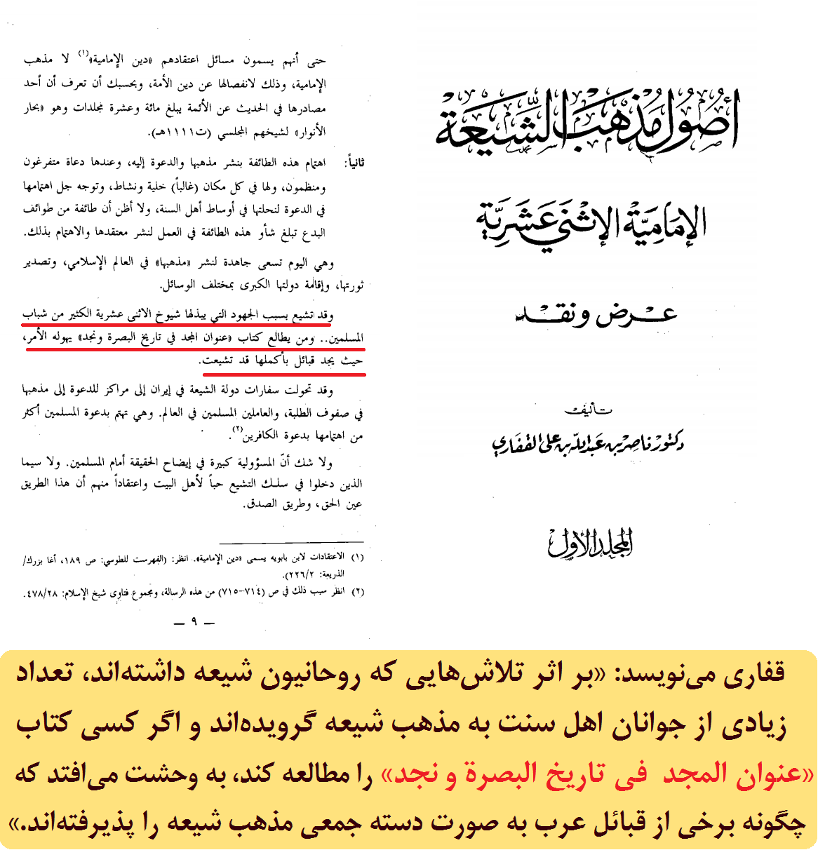 قفاری مینویسد: «بر اثر تلاشهایی که روحانیون شیعه داشتهاند، تعداد زیادی از جوانان اهل سنت به مذهب شیعه گرویدهاند و اگر کسی کتاب «عنوان المجد فی تاریخ البصرة و نجد» را مطالعه کند، به وحشت میافتد که چگونه برخی از قبائل عرب به صورت دسته جمعی مذهب شیعه را پذیرفتهاند.»