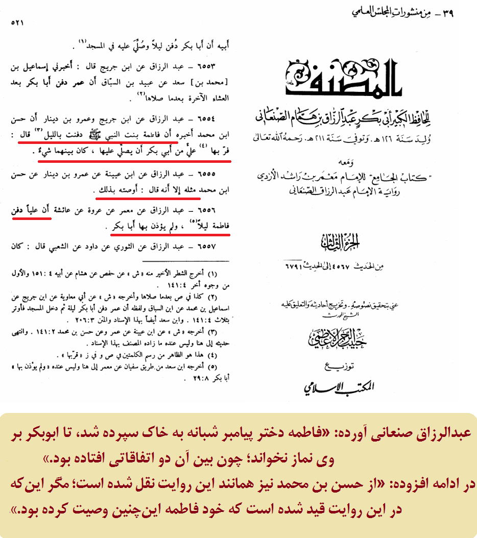 عبدالرزاق صنعانى آورده: «فاطمه سلاماللهعلیها دختر پيامبر صلیاللهعلیهوآله شبانه به خاك سپرده شد، تا ابوبكر بر وى نماز نخواند؛ چون بين آن دو اتفاقاتى افتاده بود.»