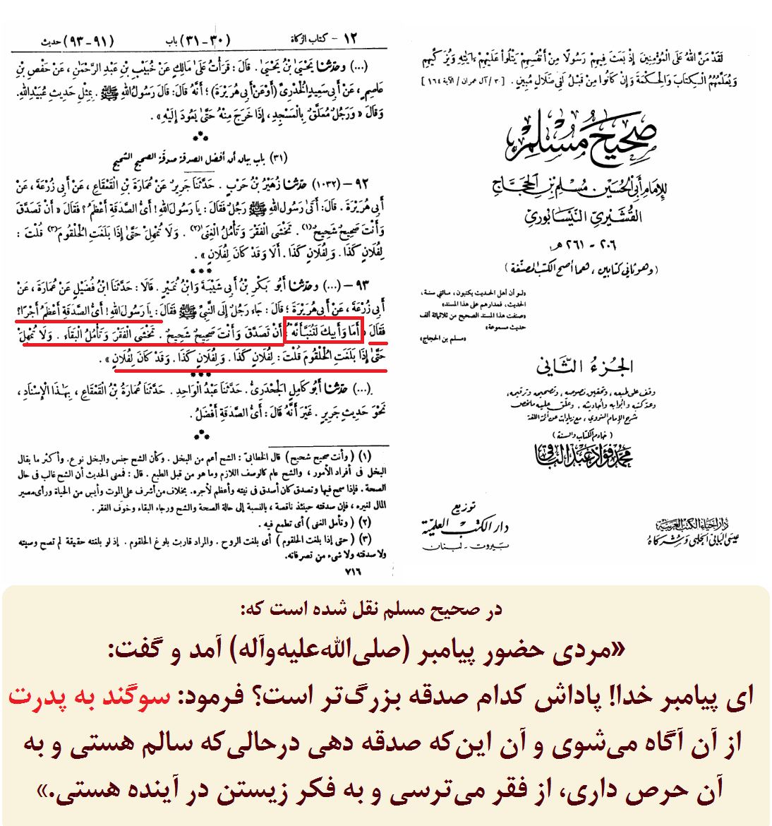 در صحيح مسلم نقل شده است كه: «مردى حضور پيامبر (صلىاللهعليهوآله) آمد و گفت: اى پيامبر خدا! پاداش كدام صدقه بزرگتر است؟ فرمود: سوگند به پدرت از آن آگاه مىشوى و آن اينكه صدقه دهى درحالىكه سالم هستى و به آن حرص دارى، از فقر مىترسى و به فكر زيستن در آينده هستى.»