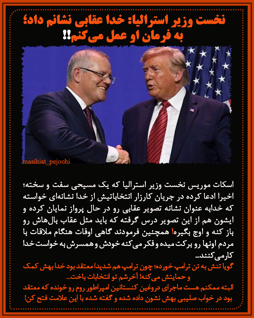 » نخست وزیر استرالیا: خدا عقابی نشانم داد؛ به فرمان او عمل میکنم!