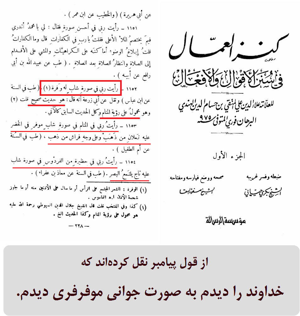 از قول پیامبر نقل کردهاند که خداوند را دیدم به صورت جوانی موفرفری.کنزالعمال، متقی هندی، ج1، ص228.مقاله: «عدم رؤیت خداوند در قرآن، و خلاف آن در روایات!»