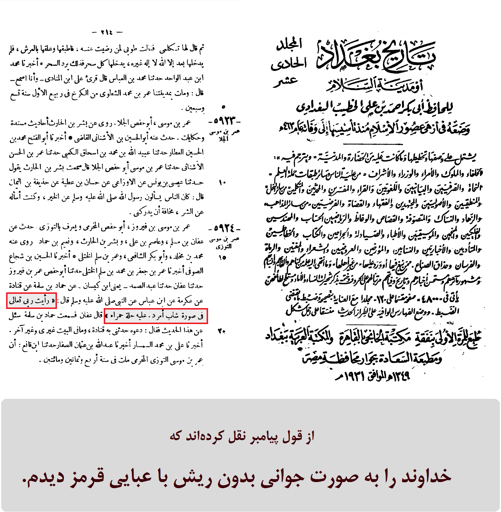 از قول پیامبر نقل کردهاند که خداوند را دیدم به صورت جوانی بدون ریش با عبایی قرمز.
