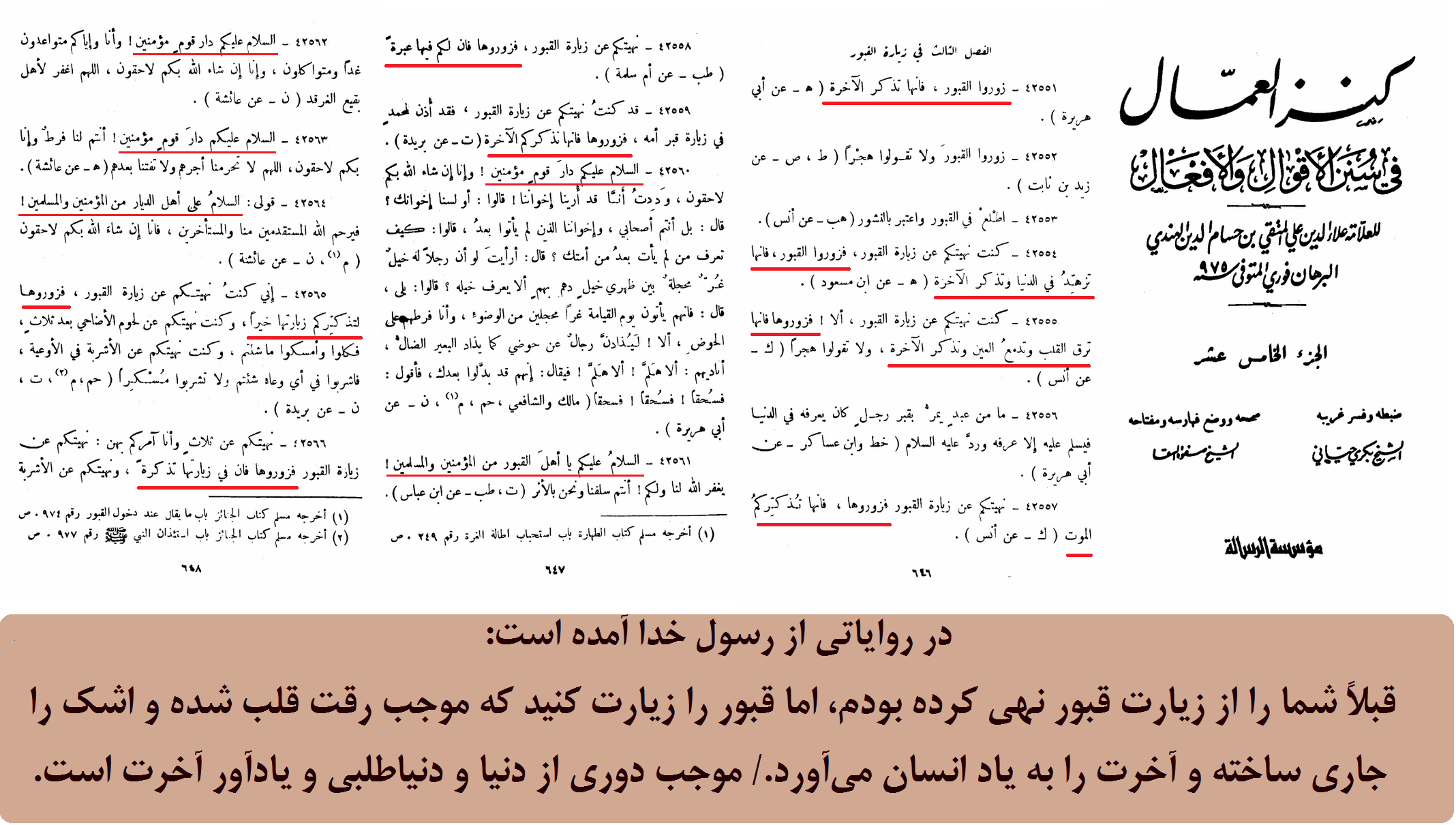 قبلاً شما را از زیارت قبور نهی کرده بودم، اما قبور را زیارت کنید که موجب رقت قلب شده و اشک را جاری ساخته و آخرت را به یاد انسان می‌آورد.