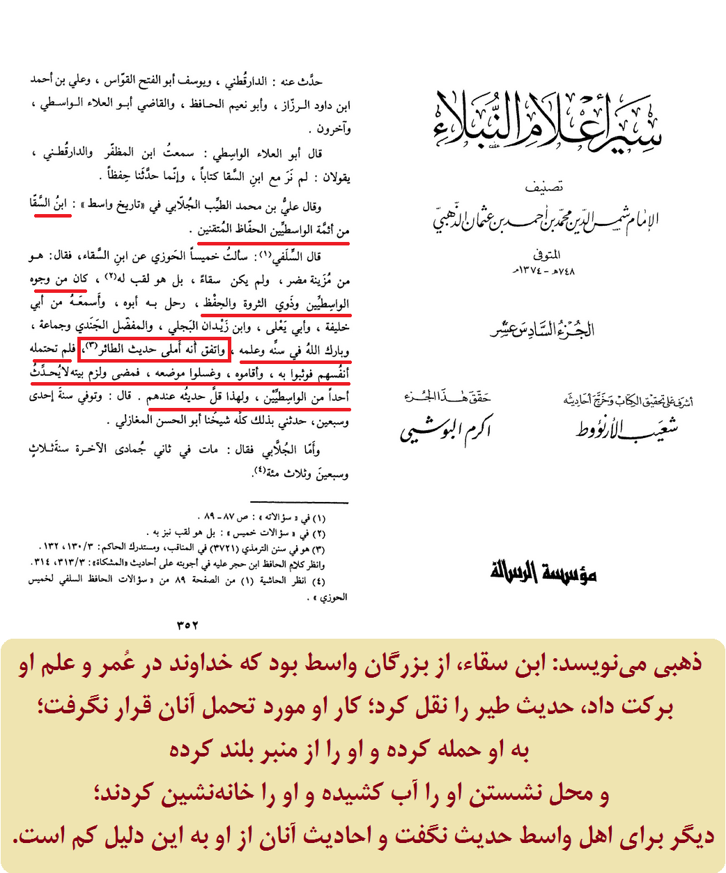 ذهبی مینویسد: ابن سقاء، از بزرگان واسط که خداوند در عمر و علم او برکت داد، حدیث طیر را نقل کرد؛ کار او مورد تحمل آنان قرار نگرفت؛ به او حمله کرده و او را از منبر بلند کرده و محل نشستن او را آب کشیده و او را خانهنشین کردند؛ دیگر برای اهل واسط حدیث نگفت و احادیث آنان از او به این دلیل کم است.