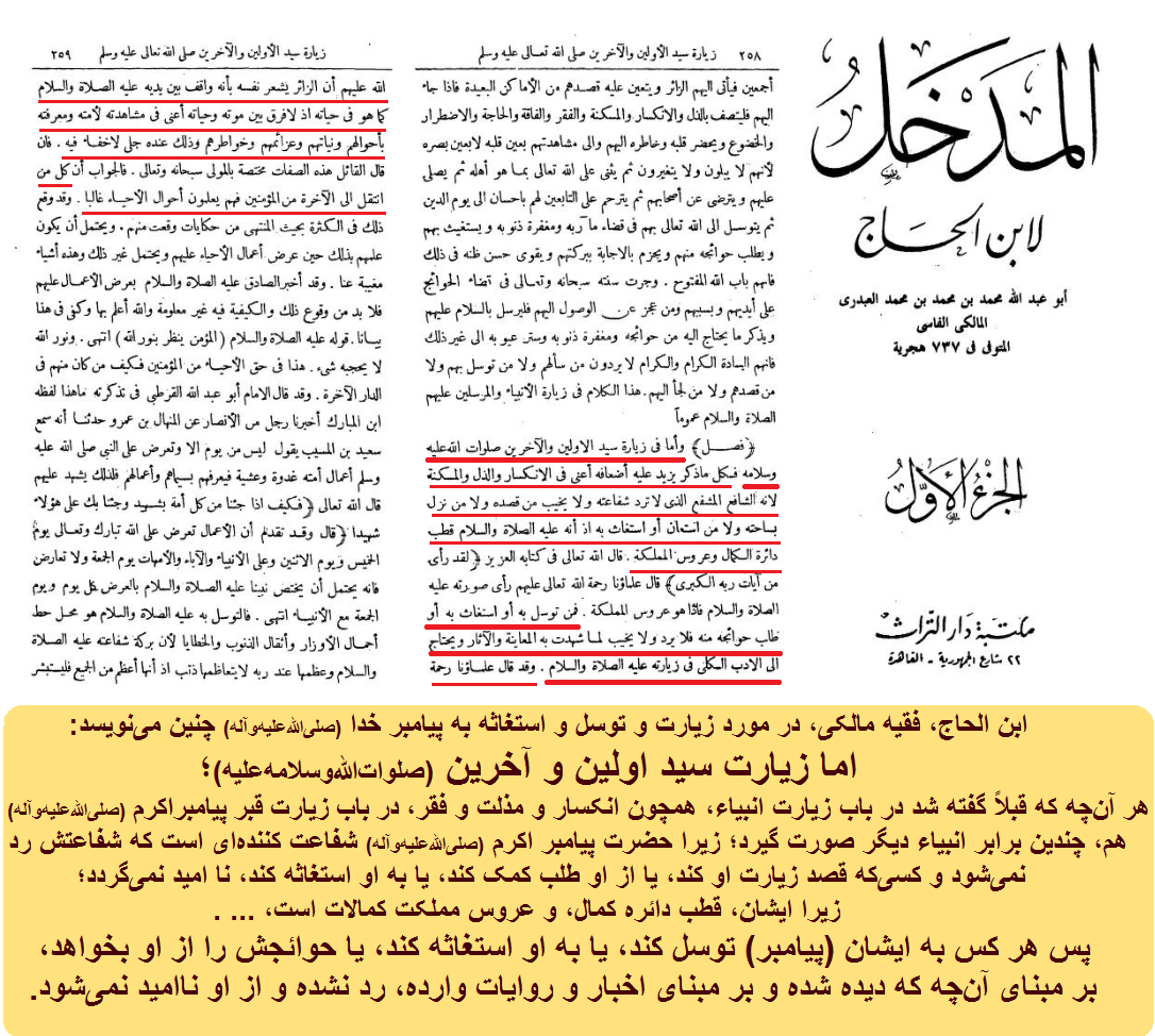 ابن الحاج، فقیه مالکی، در مورد زیارت و توسل و استغاثه به پیامبر خدا (صلی‌الله‌علیه‌وآله) چنین می‌نویسد: