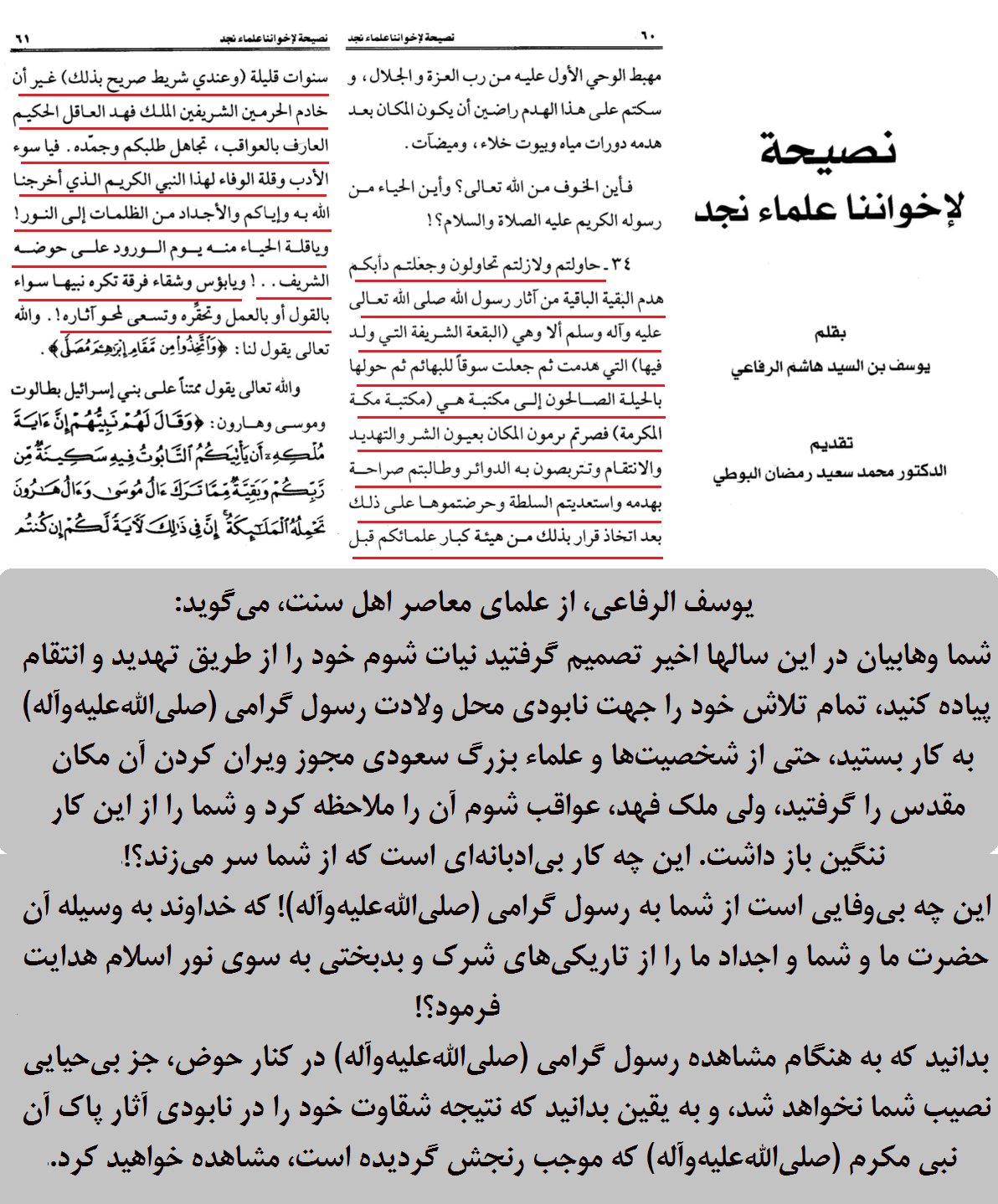 نصیحه لاخواننا علماء نجد، یوسف الرفاعی، ص60.