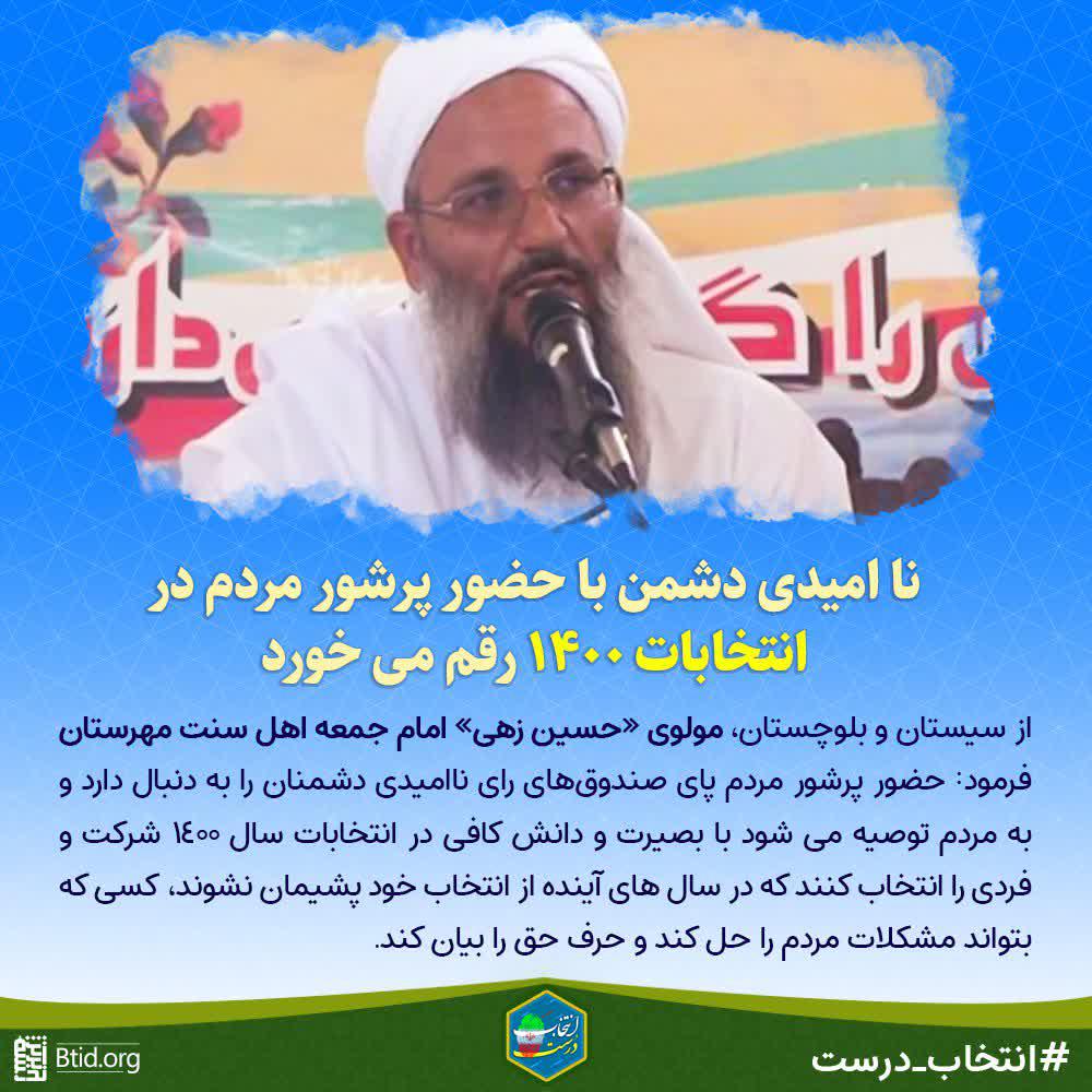 از سیستان و بلوچستان، مولوی «حسین زهی»، امام جمعه اهل سنت مهرستان گفت: حضور پرشور مردم پای صندوقهای رأی، ناامیدی دشمنان را به دنبال دارد و به مردم توصیه میشود با بصیرت و دانش کافی در انتخابات سال ۱۴۰۰ شرکت و فردی را انتخاب کنند که در سالهای آینده، از انتخاب خود پشیمان نشوند، کسیکه بتواند مشکلات مردم را حل کند و حرف حق را بیان کند.