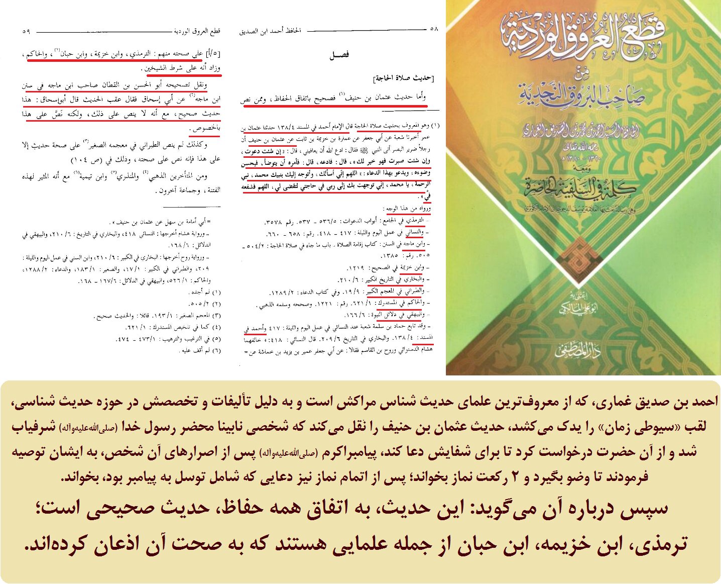 احمد بن صدیق غماری، که از معروفترین علمای حدیث شناس مراکش است و به دلیل تألیفات و تخصصش در حوزه حدیث شناسی، لقب «سیوطی زمان» را یدک میکشد، حدیث عثمان بن حنیف را نقل میکند که شخصی نابینا محضر رسول خدا (صلیاللهعلیهوآله) شرفیاب شد و از آن حضرت درخواست کرد تا برای شفایش دعا کند، پیامبراکرم (صلیاللهعلیهوآله) پس از اصرارهای آن شخص، به ایشان توصیه فرمودند تا وضو بگیرد و 2 رکعت نماز بخواند؛ پس از اتمام نماز نیز دعایی که شامل توسل به پیامبر بود، بخواند.