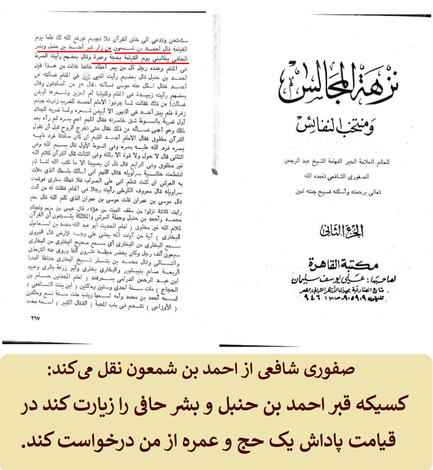 صفوری شافعی از احمد بن شمعون نقل میکند: کسیکه قبر احمد بن حنبل و بشر حافی را زیارت کند در قیامت پاداش یک حج و عمره از من درخواست کند.