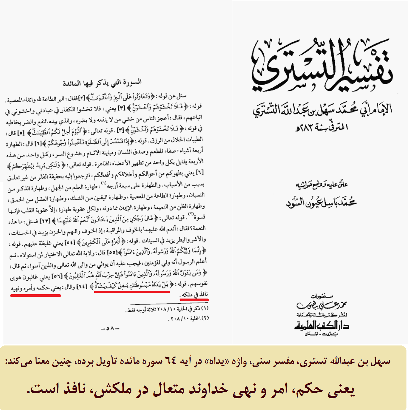 سهل بن عبدالله تستری، مفسر سنی، واژه «یداه» در آیه 64 سوره مائده تأویل برده، چنین معنا میکند: يعنی حكم، امر و نهی خداوند متعال در ملکش، نافذ است.