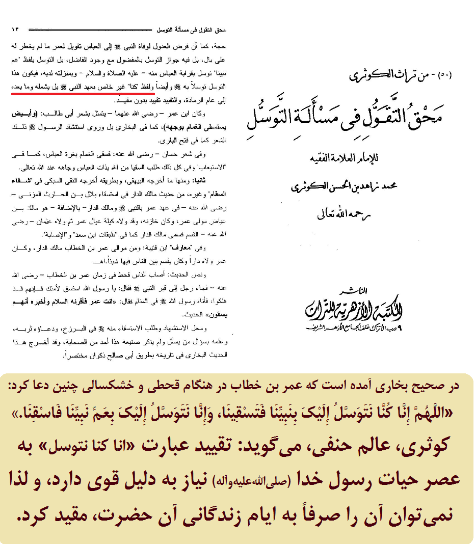 کوثری، عالم حنفی، می‌گوید: تقیید عبارت «انا کنا نتوسل» به عصر حیات رسول خدا (صلی‌الله‌علیه‌وآله) نیاز به دلیل قوی دارد، و لذا نمی‌توان آن را صرفاً به ایام زندگانی آن حضرت، مقید کرد.